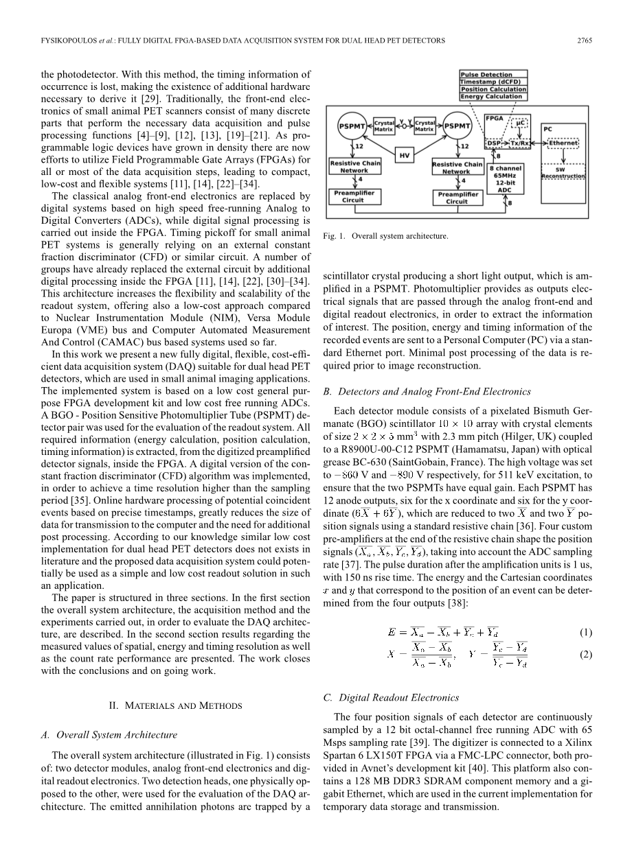 每个探测器模块包含了一个像素化锗酸铋(BGO)的带有2.3mm间距的2times;2times;5尺寸的水晶元素闪烁体阵列,同时带有一个R8900U-00-C12 PSPMT(滨松,日本)与光学油脂BC-630(圣戈班,法国)。对于511keV的激励,高电压分别设置为-860V和-890V,来保证两个PSPMTs有平等的增益。每个PSPMTs有12个正极输出,分别是x坐标6个和y坐标6个(),使用一个标准的电阻链减少为2个x坐标和2个y坐标。在电阻链的末端的四个自定义的预放大器确定了位置信号,并考虑ADC的采样速率。扩增单位后的脉冲持续时间为1us,其中上升沿时间为150ns。能量和笛卡尔坐标和对应于时间的位置可以从四个输出来确定: