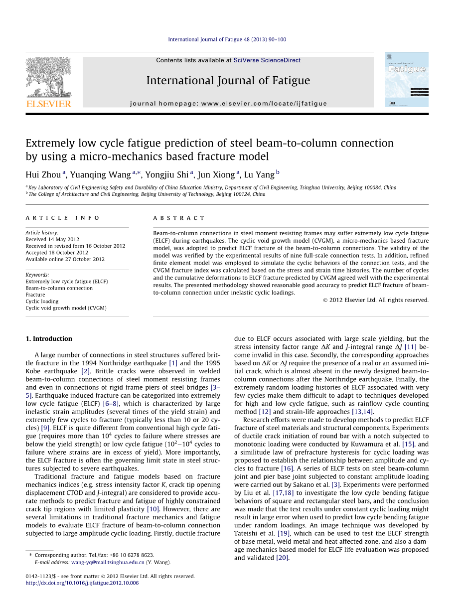 近日,更广义的基于模型的微观力学,如虚空增长模型(VGM)和循环空洞增长模型(CVGM),被开发来分别预测由于单调和循环荷载作用下的裂缝的产生。CVGM模型的精度是由一系列的钝缺口紧凑拉伸试样和哑铃形钢试样的循环测试证实的,同时适用性是由焊接钢管柱底板连接的循环试验证明的。另外,在钢支撑框架构件的局部压曲区域可以用CVGM模型来预测极低周疲劳断裂。而且,人们建立了一种基于低周疲劳和微观力学的概念的方法来预测地震荷载作用下焊接梁与柱连接的疲劳寿命。根据这种方法,累计裂纹长度是由应变和应力三轴的时程来计算的(平均应力与von Mises应力的比)。