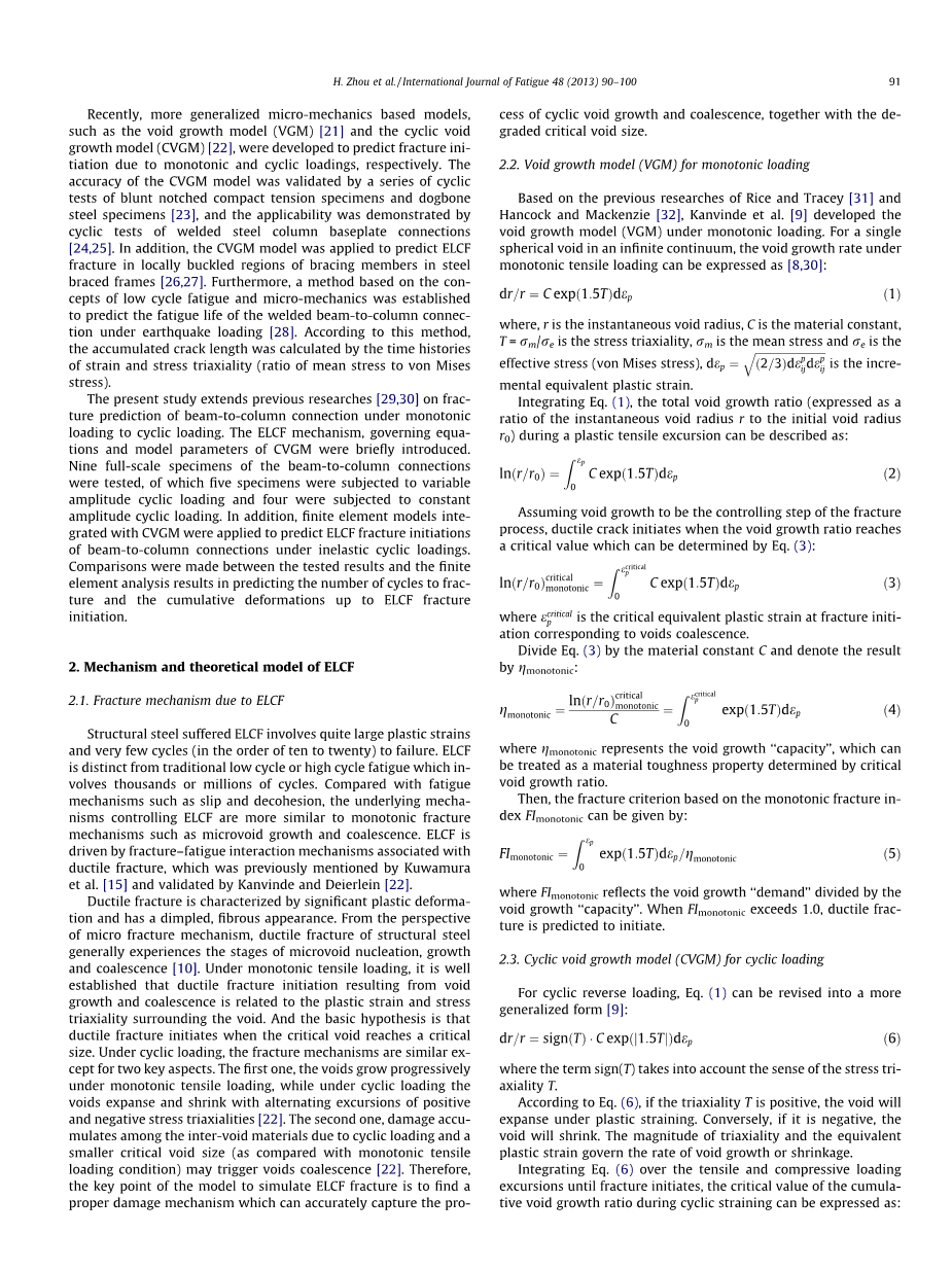 韧性断裂的特征在于显著塑性变形和具有凹形,纤维状外观。从微观断裂机制的角度来看,结构钢的韧性断裂通常经历微孔成核,生长和聚结阶段。在单调拉伸荷载作用下,从孔洞长大和聚合产生的延性起裂是与孔洞周围的塑性应变和应力三轴有关的,这是公认的。并且基本假设是,延性破裂在临界空隙达到临界尺寸时开始。循环荷载作用下,断裂机制之间除了两个关键方面以外都很相似。第一个,孔洞在单调拉伸荷载作用下逐步增长,而循环荷载作用下孔洞随着正面和负面的应力三轴交替出现而扩张和收缩。第二个,由于循环加载,损伤在内部孔隙材料中累积,而且一个较小的临界孔隙尺寸(与单调拉伸载荷条件相比)可能引发孔隙聚结。因此,模拟超低周疲劳断裂的模型的关键点在于找到一个合适的破坏机理,可以准确地捕捉周期的孔洞增长和聚合的过程,以及退化的临界孔洞尺寸。