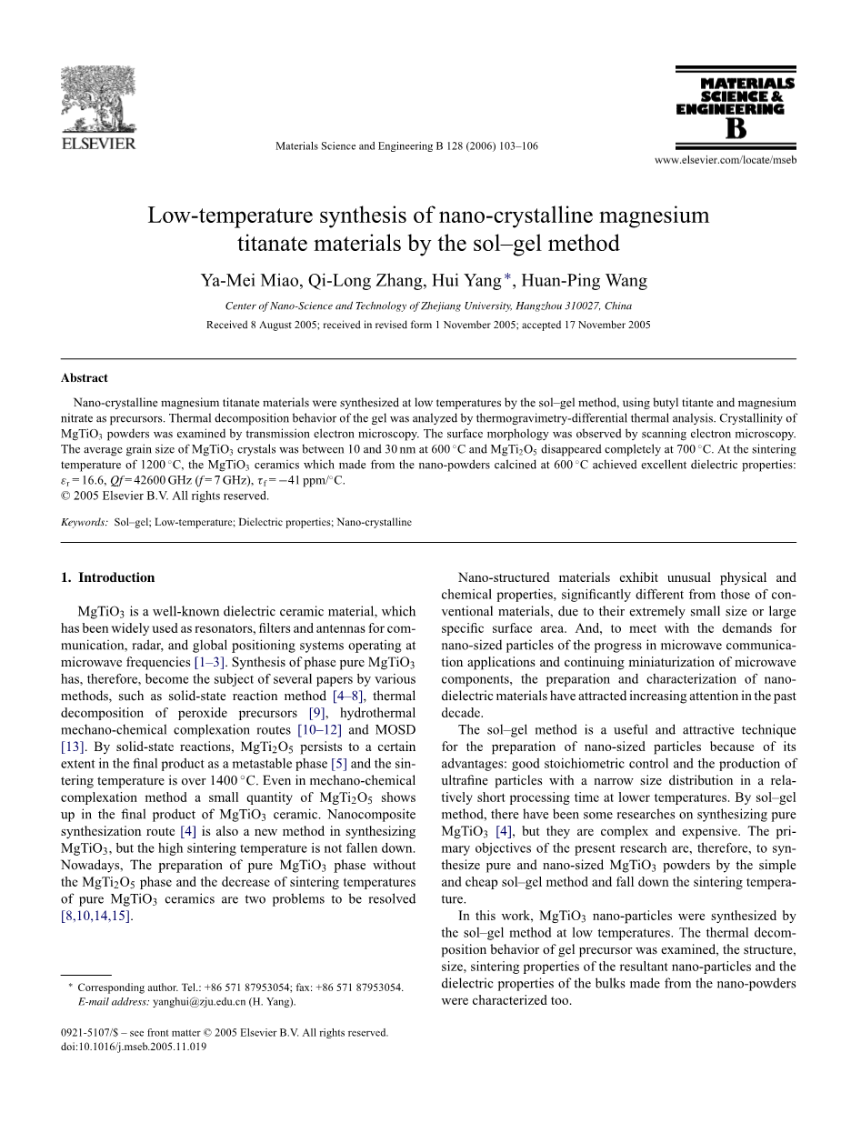 通过溶胶-凝胶法进行纳米晶钛酸镁材料的低温合成