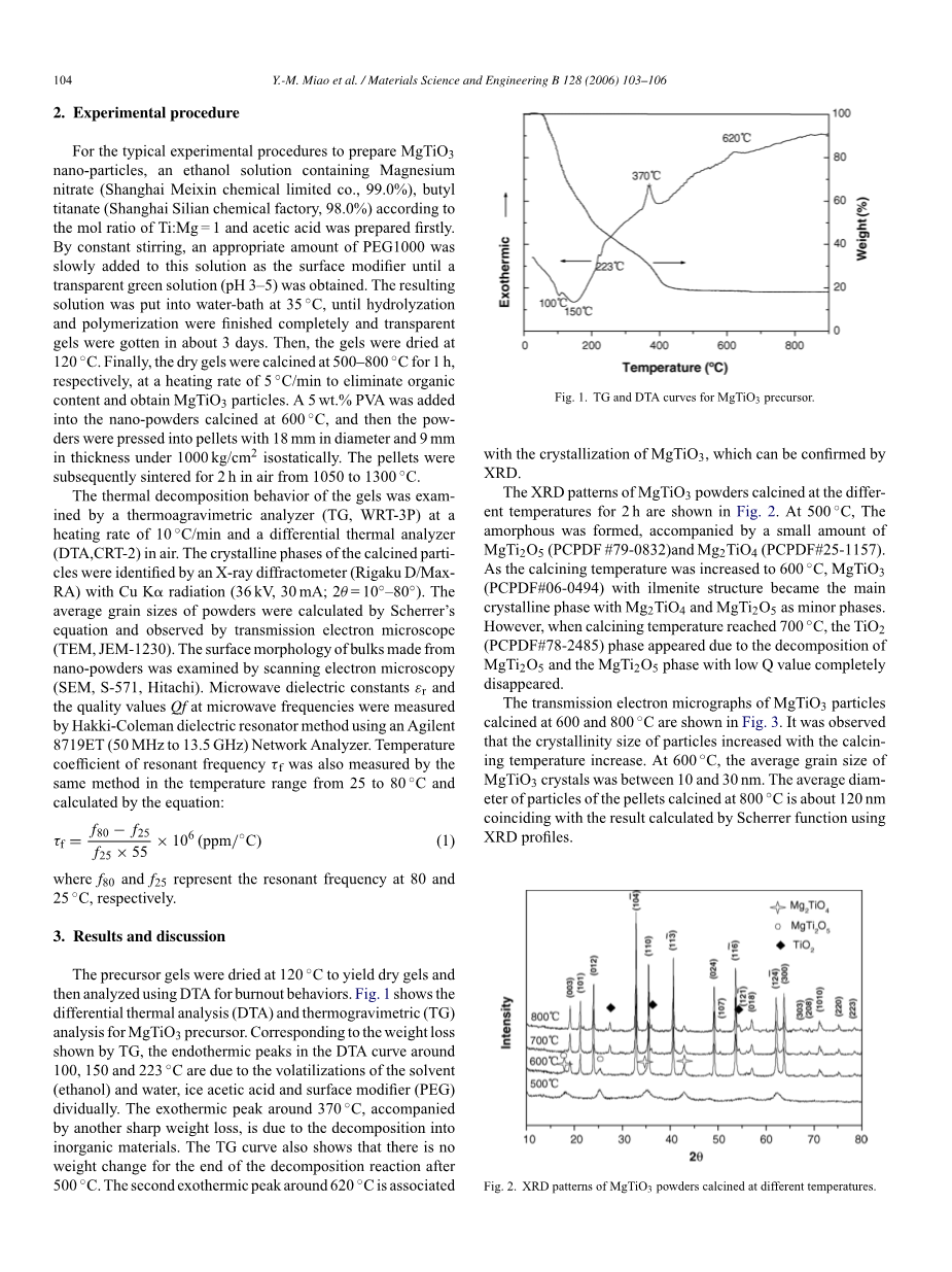 对典型的制备MgTiO3纳米粉体实验方法,首先按照摩尔比Ti:Mg=1:1制备含有硝酸镁(上海美心化工有限公司,99.0%),钛酸丁酯(上海泗联化工,98.0%),醋酸的乙醇溶液。恒温搅拌,向溶液中缓慢加入适量PEG 1000作为表面改性剂,直到获得绿色透明溶液(pH 3-5)。将得到的溶液保持35℃水浴,直到水解和聚合反应完全,获得透明凝胶,这个过程大约需要3天时间。然后,将凝胶在120℃干燥。最后,将干燥的凝胶以5℃/min的升温速率在500-800℃中煅烧1小时,以消除有机物 ,获得MgTiO3粉体。将5%(质量比)的PVA加入到在600℃下煅烧后的纳米粉末中,然后将所得粉末在1000kg/cm2等静压下压制成直径18mm厚度9mm的圆柱体。随后在空气气氛中,1050-1300℃下烧结2小时。