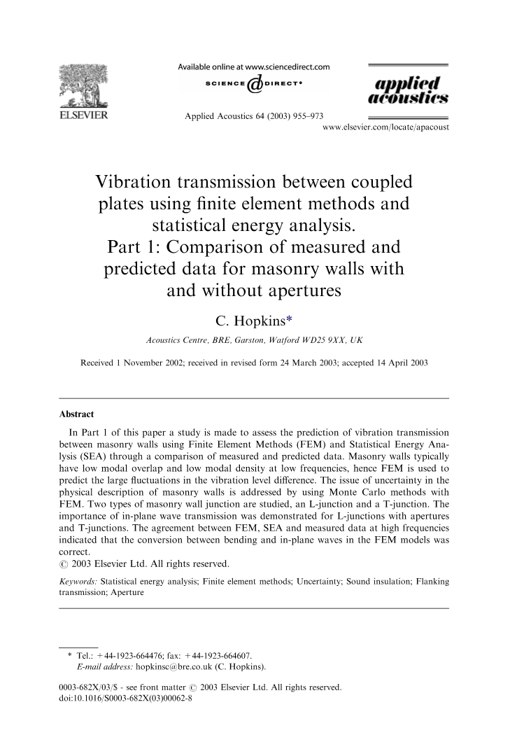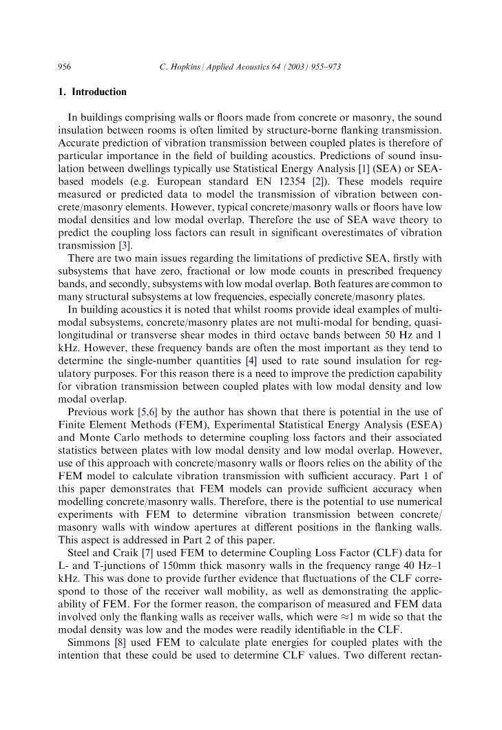 西蒙斯用有限元计算耦合板的能量是因为这些数据可以用来确定耦合损失因素的值。由两种不同模型来进行计算: 956C.霍普金斯模型和应用声学64(2003)955 - 2003喉板结构模型都可以使用有限元法分析并测量。平面波长相比板的尺寸要大的多(经常发生在全尺寸砌体墙上)。但是西蒙斯表示,在有限元模型中,这项研究并没有证实弯曲和平面波之间会发生转换。
