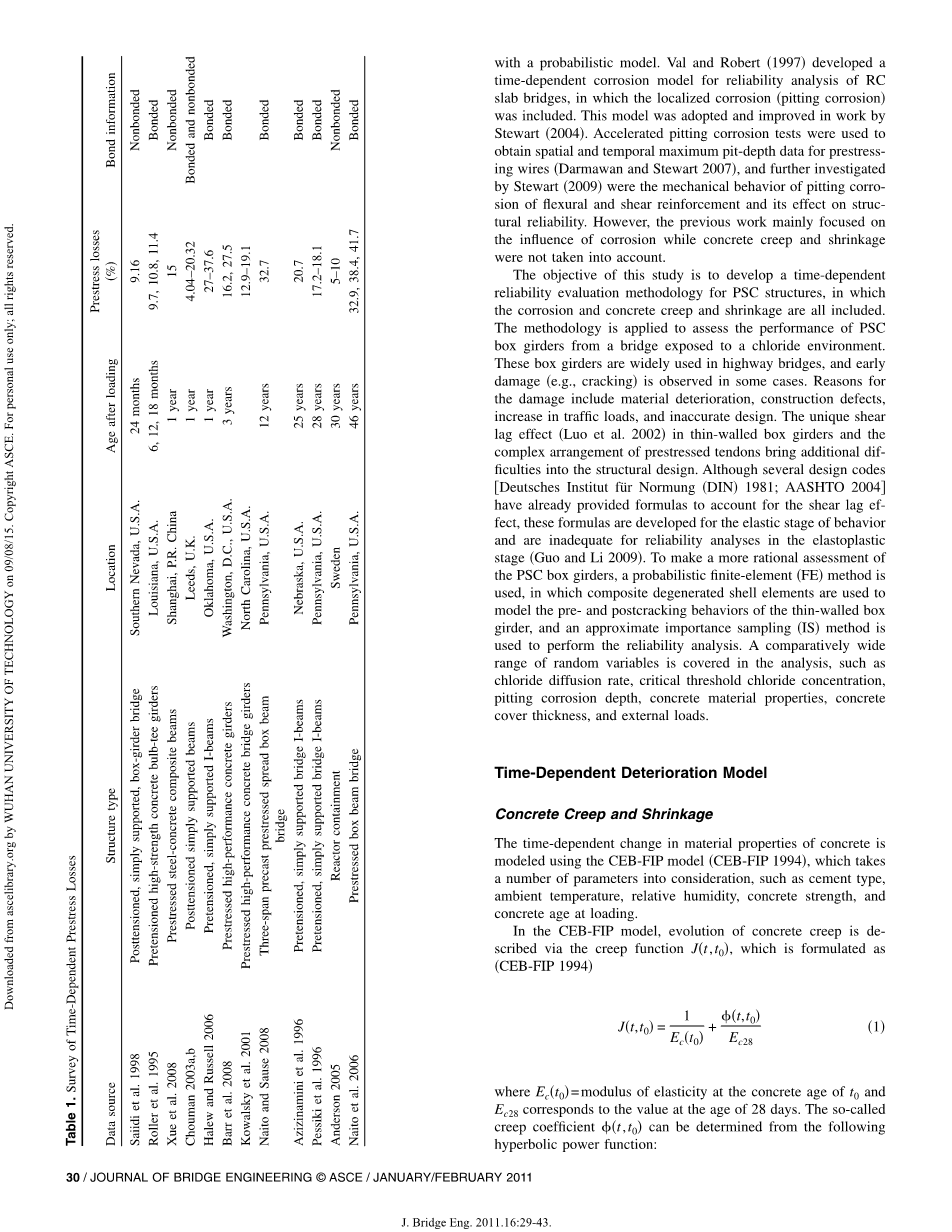 考虑到收缩、徐变和腐蚀的精确建模对结构的设计和评估的重要性,我们已经进行了几十年的广泛调查。现有的混凝土徐变和收缩模型包括有效模量法(McMillan 1916),徐变二次幕定律(Bazant and Osman 1976),ACI的209模型[美国混凝土研究院(ACI)1982],徐变双幂对数律(Bazant and Chern 1984),CEB-FIP模型(CEB-FIP 1994),B3模型(RILEM TC-107-GCS 1995)和GL2000模型(Gardner and Lockman 2001)。这些模型是由Goel et al.(2007)提出的比较,得出的结论是最近开发的GL2000模型的设计,B3模型,与ACI 209模型比以前的徐变模型更可靠。
