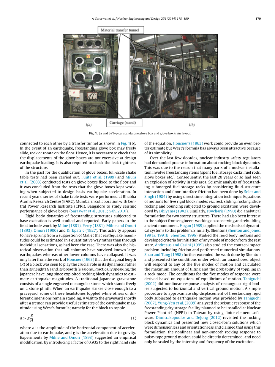 在过去的几十年里,核工业安全监管机构已经要求准确的摇摆块动态信息。这是由于许多部分核设施包括独立的原因(乏燃料贮存桶、燃料棒、手套箱等)。因此,近20年来,在这一领域里看到了一次爆炸性的活动。独立式燃油储存架考虑流体结构相互作用的地震分析以及索勒和辛格采用直接积分法(1984)得到的的地板界面之间的摩擦。 Ishiyama (1982)得到受到地面激励的五个刚性块模的运动方程如休息、滑动、摇摆,摇摆和上下晃动。 同样,psycharis(1990)做了两层结构的解析公式。在保存和重建古代纪念碑的工程师们对此也有兴趣。Hogan(1989)把动态系统的方法应用于这一问题。同样,Shenton (Shenton and Jones,1991a, 1991b; Shenton, 1996)研究了刚体运动和发展为从静止状态运动的任何模式启动标准。Andreaus and Casini (1999)研究了接触冲击问题包括摩擦并进行了数值模拟。Shao and Tung (1998)进一步扩展Shenton,工作并且提出了条件,在该条件下未锚定的对象将回应任何运动的五种模式以及计算倾斜、倾倒在岩石模式概率的最大数量。根据运动的平衡方程,推导了五种反应模式的条件。Taniguchi(2002) 对经受水平和垂直地运动的矩形刚体做了非线性响应分析。 Taniguchi(2007)提供了一个简单的程序近似遭受地震作用独立刚体的滑移位移。Yung-Yen et al. (2009)用有限元软件分析了独立的干式贮存设施的地震反应,该设施计划安装在台湾的核电厂。Dimitrakopoulos and DeJong (2012)再次研究了摇摆块体动力学并提出新的封闭式解决方案,声称使用该方案非线性和非平稳的摇摆对脉冲型地震动的响应可以被直接确定。而需要的强度和频率的激励只需要缩放。