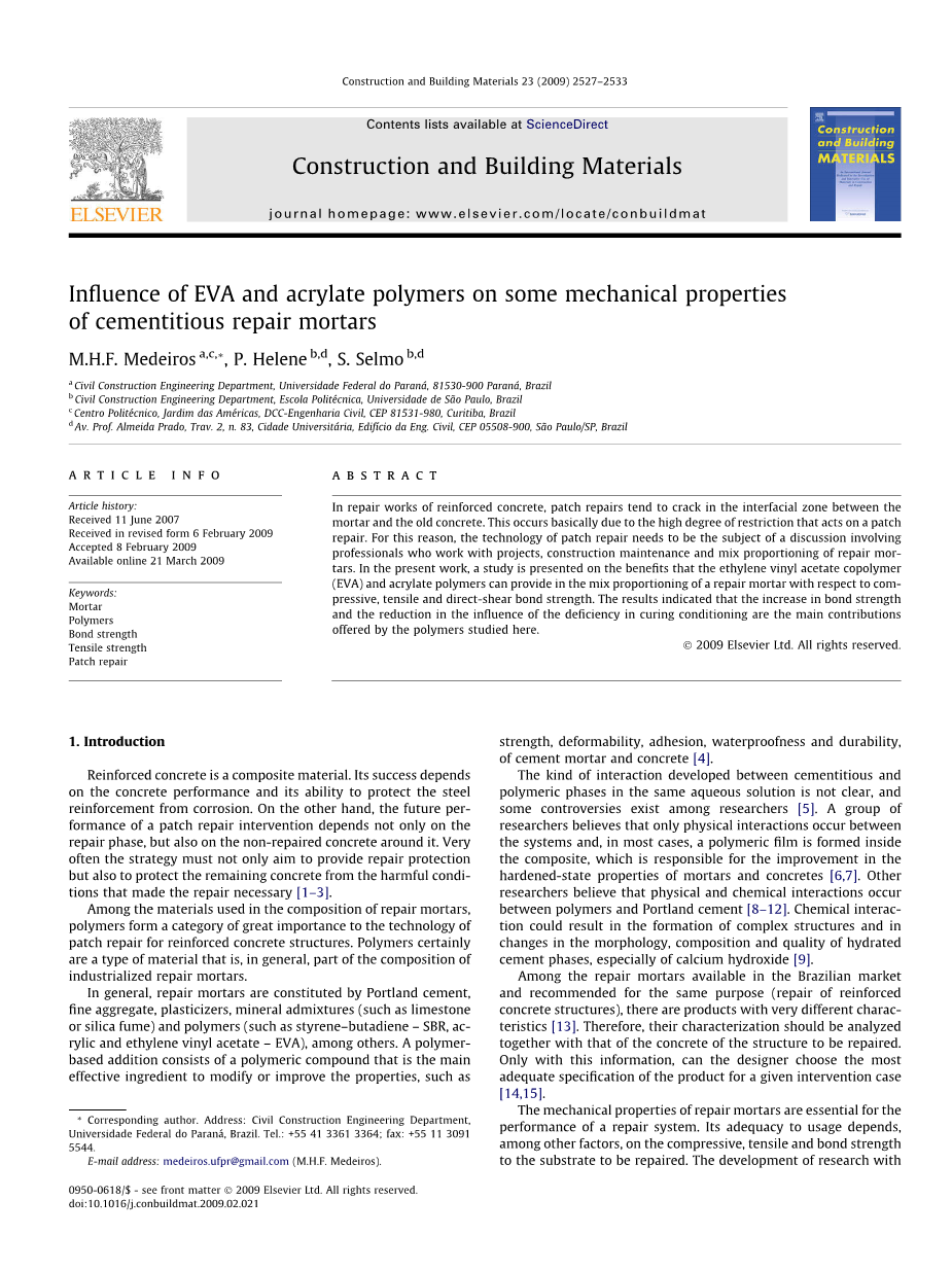摘 要:在钢筋混凝土的修补工作中,砂浆和旧混凝土之间界面区域裂缝往往采用补丁修补的方式。这样做的目的是一个修复补丁可以起到高度的约束作用。出于这个目的,补丁修补的技术是一个需要研究的课题,涉及那些从事建设维护和修补砂浆混合配比的专业人员。在本项研究工作中得出,在修补砂浆中加入混合配比的乙烯醋酸乙烯酯共聚物(EVA)和丙烯酸酯聚合物以提高它的抗压,抗折,垂直剪切粘接强度。同时结果表明,在养护环境不良条件的影响下,粘接强度的增加和减少,主要受所研究聚合物掺量的影响。