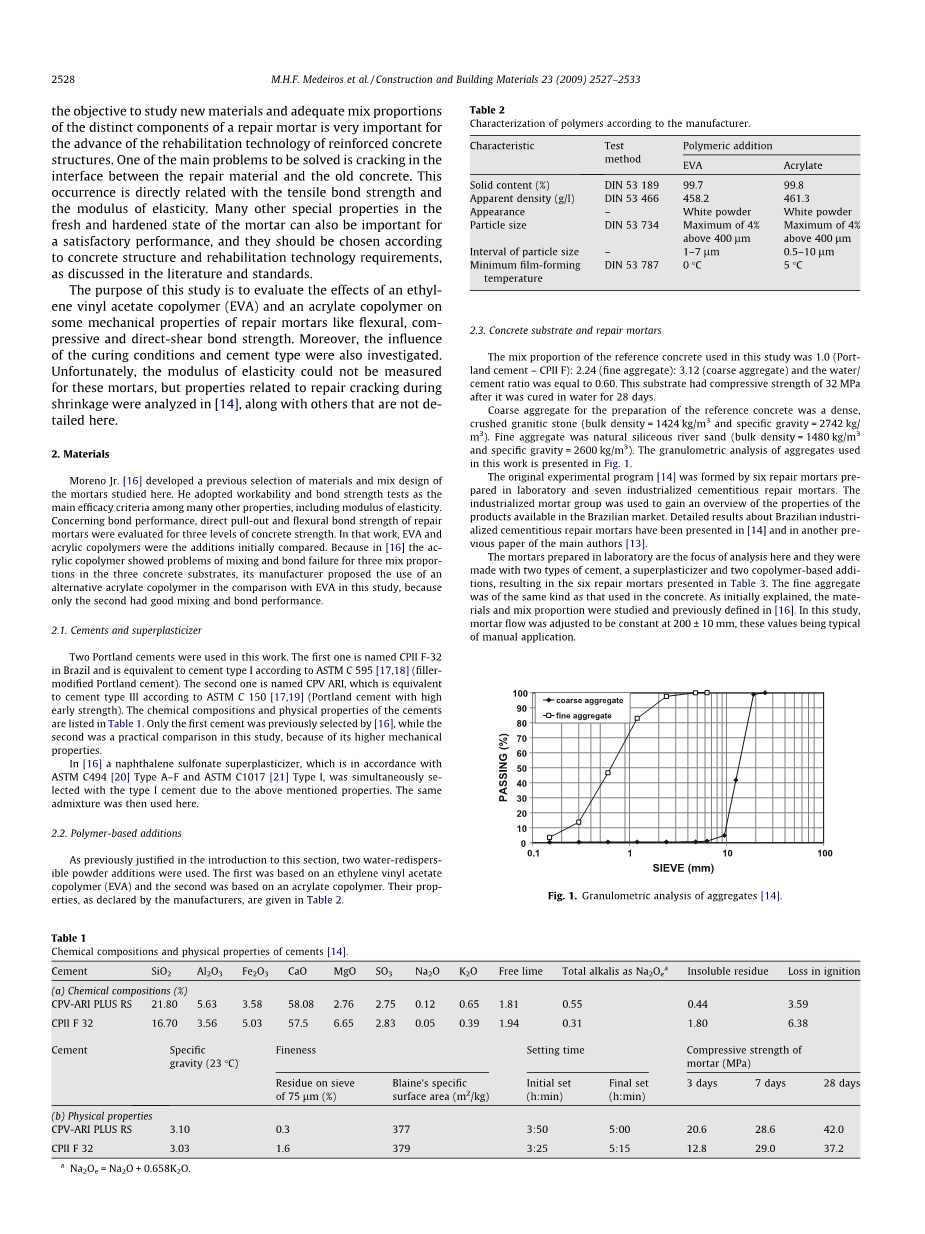 砂浆流动区域和变硬区域的其他许多特殊性质对于对获得令人满意的性能也是十分重要的,他们应该像文献和标准中说的那样,根据混凝土结构和修补技术要求来进行选择。本研究的目的是分析乙烯醋酸乙烯酯共聚物(EVA)和丙烯酸共聚物对修补砂浆力学性能的影响,如抗折、抗压和拉伸粘接强度。此外,也研究了养护条件和水泥类型的影响。不幸的是,无法测量这些砂浆的弹性模量,但是分析了在收缩期间修补裂缝的相关性能[14],和其他性能一样在这里不详细讲述。