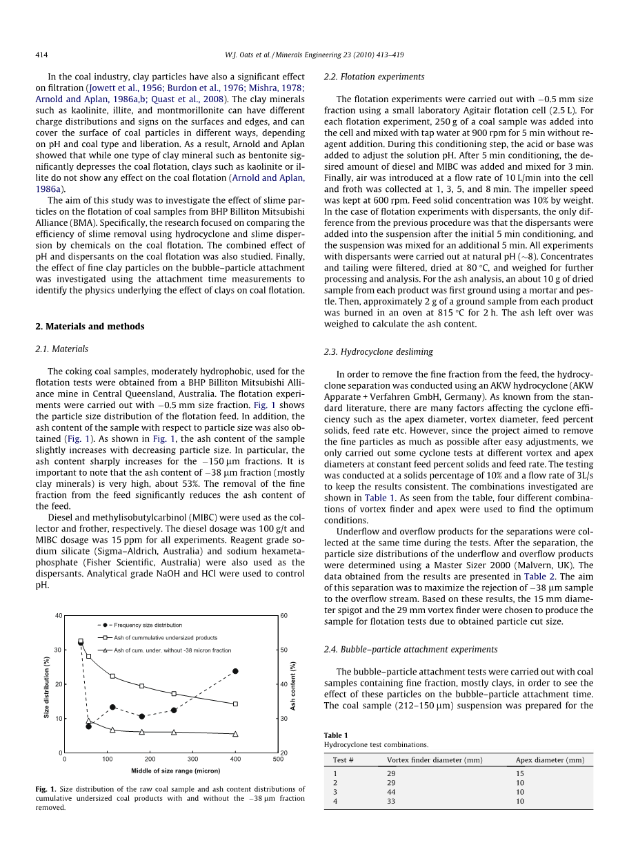 研究目的是为了探究细泥对来自BHP Billiton Mitsubishi Alliance (BMA)的煤矿试样的浮选影响。明确的是,研究重点比较用水力旋流器和化学分散剂去除细粒矿物在煤浮选中的效果。同时研究煤浮选中pH和分散剂的联合作用。最后,细粒粘土矿物对气泡-颗粒附着的影响也用附着时间等手段来进行研究,以确定黏土矿物对煤浮选影响的物理基础。