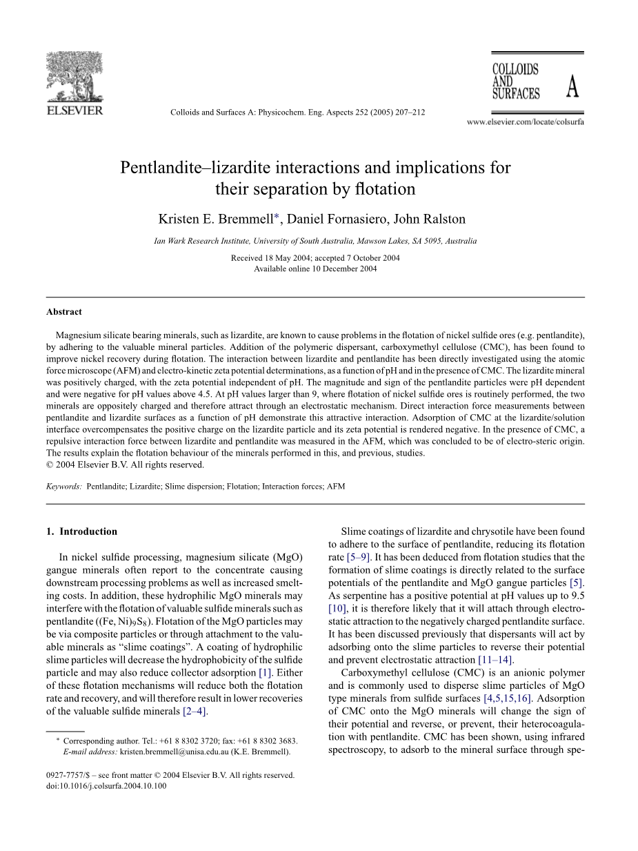硅酸镁轴承矿物,如利蛇纹石,导致浮选硫化镍矿石回收有用矿物的问题(如硫镍铁矿)。聚合物分散剂的添加,羧甲基纤维素(CMC),已被发现在浮选提高镍回收率。利蛇纹石和镍黄铁矿之间的交互作用可通过原子力显微镜(AFM)和电位电势,pH值的函数和CMC来测试研究。利蛇纹石的矿物带正电荷,电位电势独立的镍黄铁矿颗粒的大小和符号依赖pH值的且pH值高于4.5。在pH值大于9,硫化镍矿石的浮选效果很好,这两种矿物是电荷相反的,因此通过静电吸引机制。之间的直接交互力测量镍黄铁矿和利蛇纹石表面作为pH值的函数证明这一点吸引力的互动。吸附利蛇纹石/ CMC的解决方案界面过度补偿利蛇纹石的正电荷粒子及其电动电势呈现负的。在CMC的存在,排斥之间的相互作用力利蛇纹石和镍黄铁矿在AFM测量,这个结果解释了以前的和现在的浮选效果研究的问题。