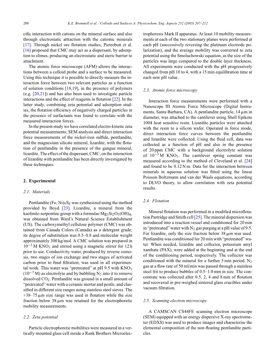 在目前的研究中我们有相关电动zeta;潜在的测量、扫描电镜分析和直接交互力测量的硫化镍,镍黄铁矿,利蛇纹石,硅酸镁的矿物的浮选镍黄铁矿,脉石矿物的存在,利蛇纹石。分散剂的作用、CMC、互动利蛇纹石的镍黄铁矿直接调查这些技巧。