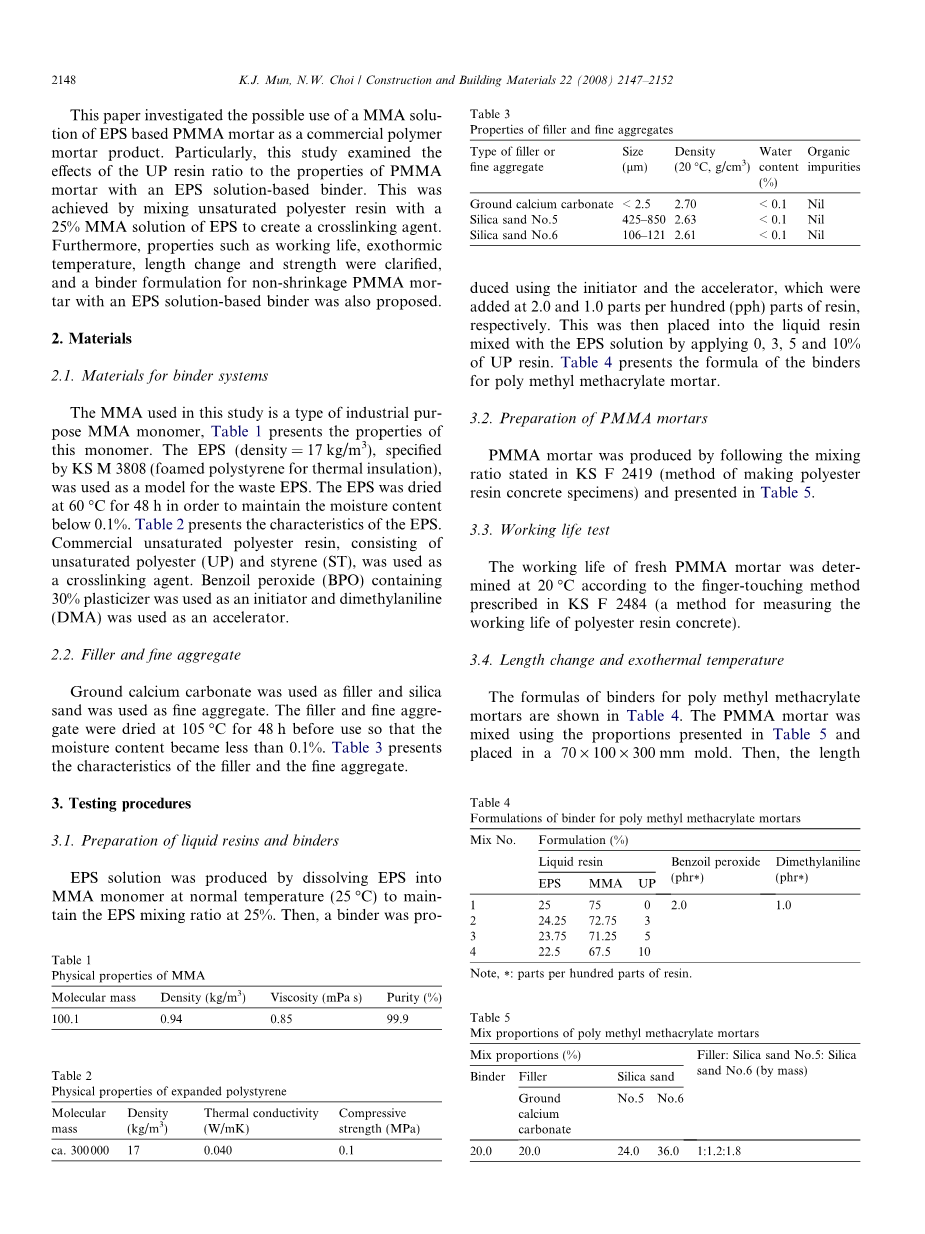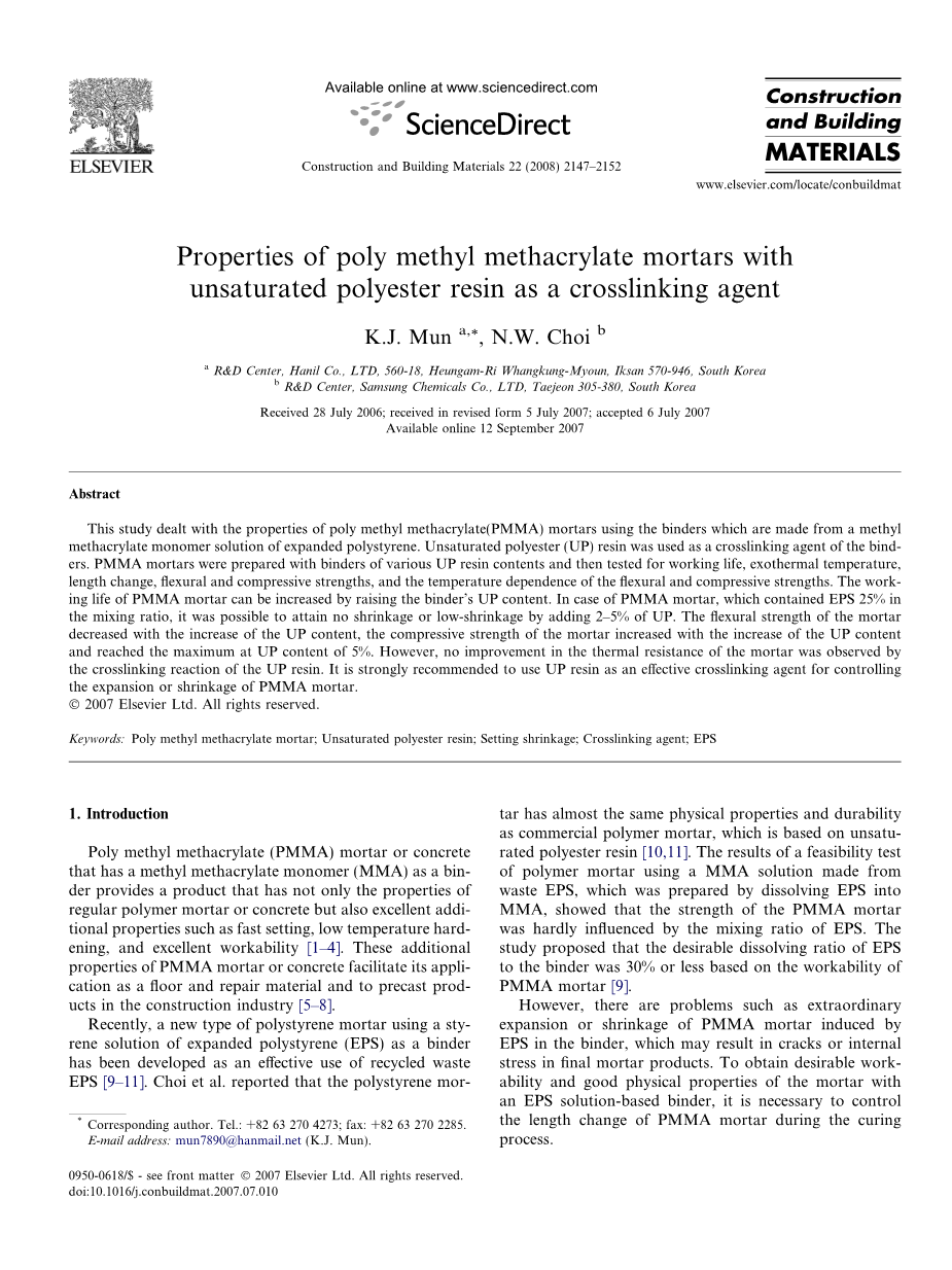 不饱和聚酯树脂作为交联剂的聚甲基丙烯酸甲酯砂浆性能的研究