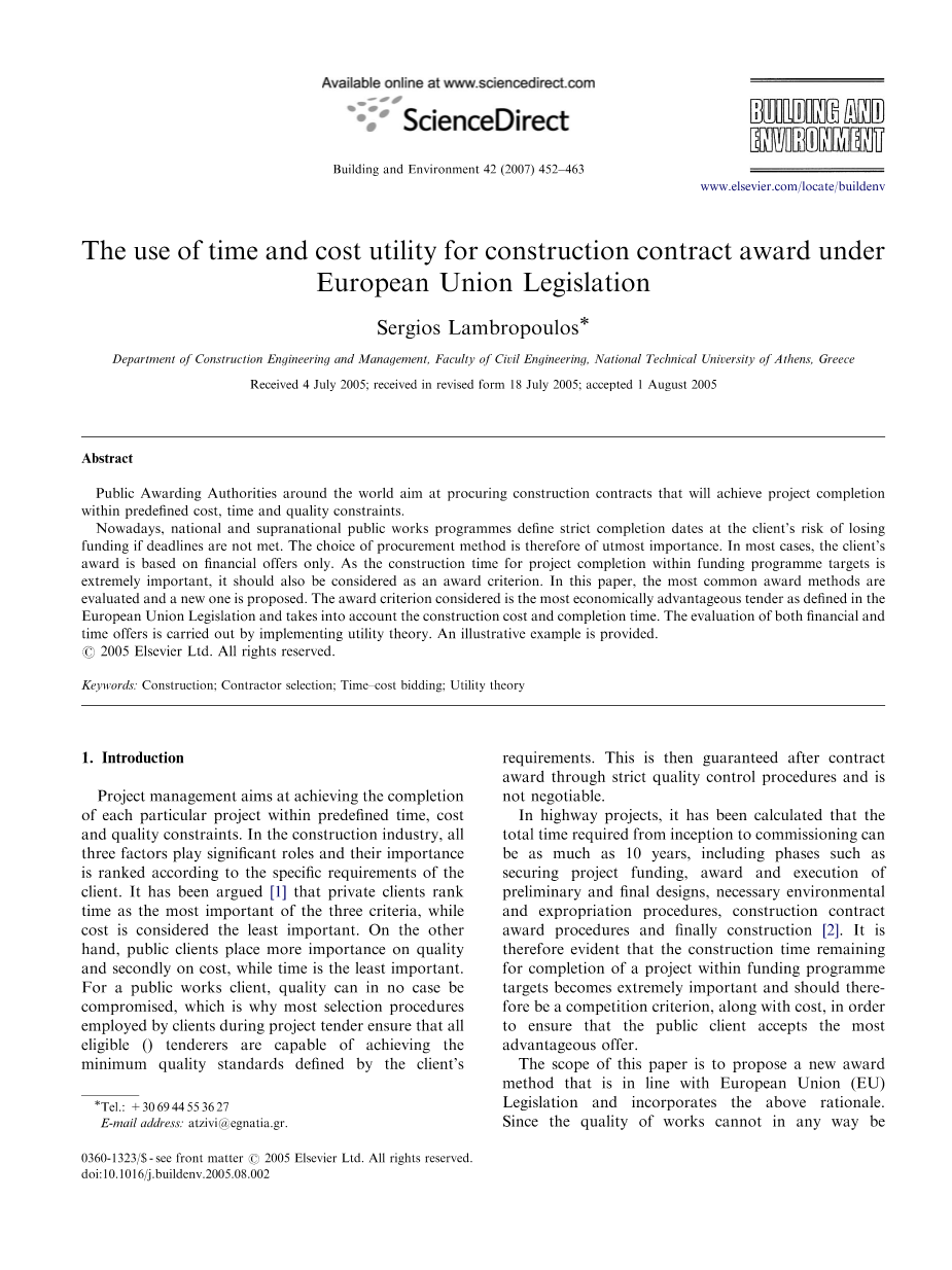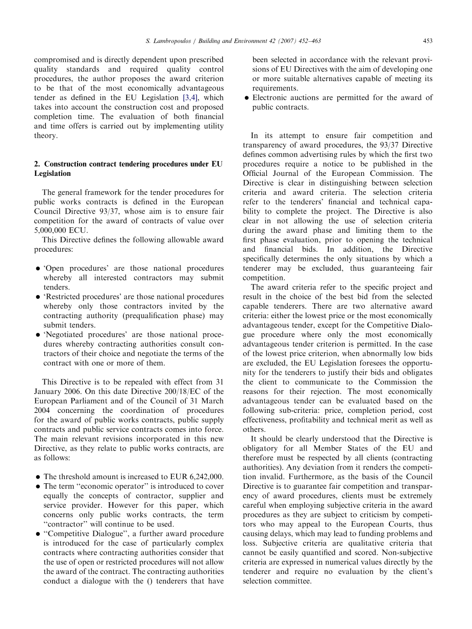 这是合同授予后保证通过严格的质量控制程序,是不可转让的。在公路项目,它已经计算出,从开始到投产所需的总时间可以是10年,包括如下阶段,确保项目资金,初步的授予和执行及最终设计,必要的环境和征收程序,建筑合同授予程序,最后施工。显而易见,在不超过计划资金目标的前提下完成一个项目的建设时间变得非常重要,因此应该作为一个竞争标准,以及成本,以确保公众客户接受最有利的报价。本文的范围是提出了一种新的奖励方法,符合欧洲联盟(欧盟)的立法,并采用上述理由。因为工作的质量无论作业都不能妥协,并且是直接取决于规定的质量标准和要求的质量控制程序,所以作者提出的奖励标准是经济最有利标在欧盟立法[ 3,4 ]的规定,考虑到施工成本,提出了完成时间。利用效用理论进行财务和时间的评价。