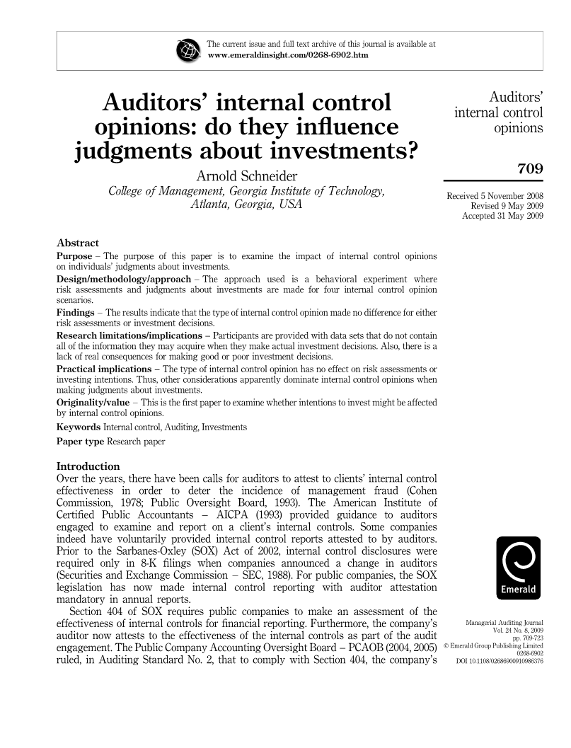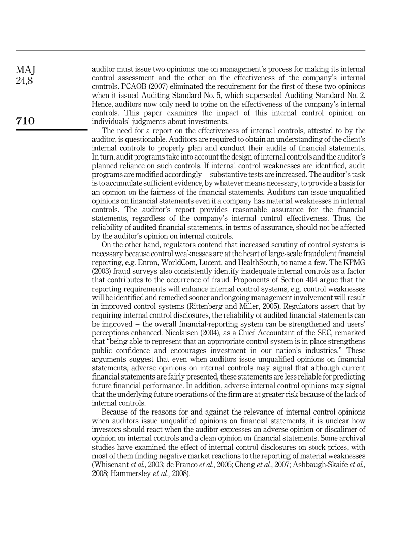 其他证据表明,财务报表使用者会在决策制定中考虑内部控制报告(德勤,安永,毕马威,普华永道,2004,p.4)。上述有关股票市场对内部控制信息披露反应的大部分研究都发现了不良影响(de Franco等, 2005; Cheng等, 2007; Irving,2006)。在信贷领域,穆迪投资者服务公司(2006)指出,重大缺陷的披露会影响债务评级。在唯一一个针对贷款决定的研究中,施耐德和丘奇(2008)发现内部控制审计的否定意见比无保留意见更易给贷款人的决策带来负面影响。