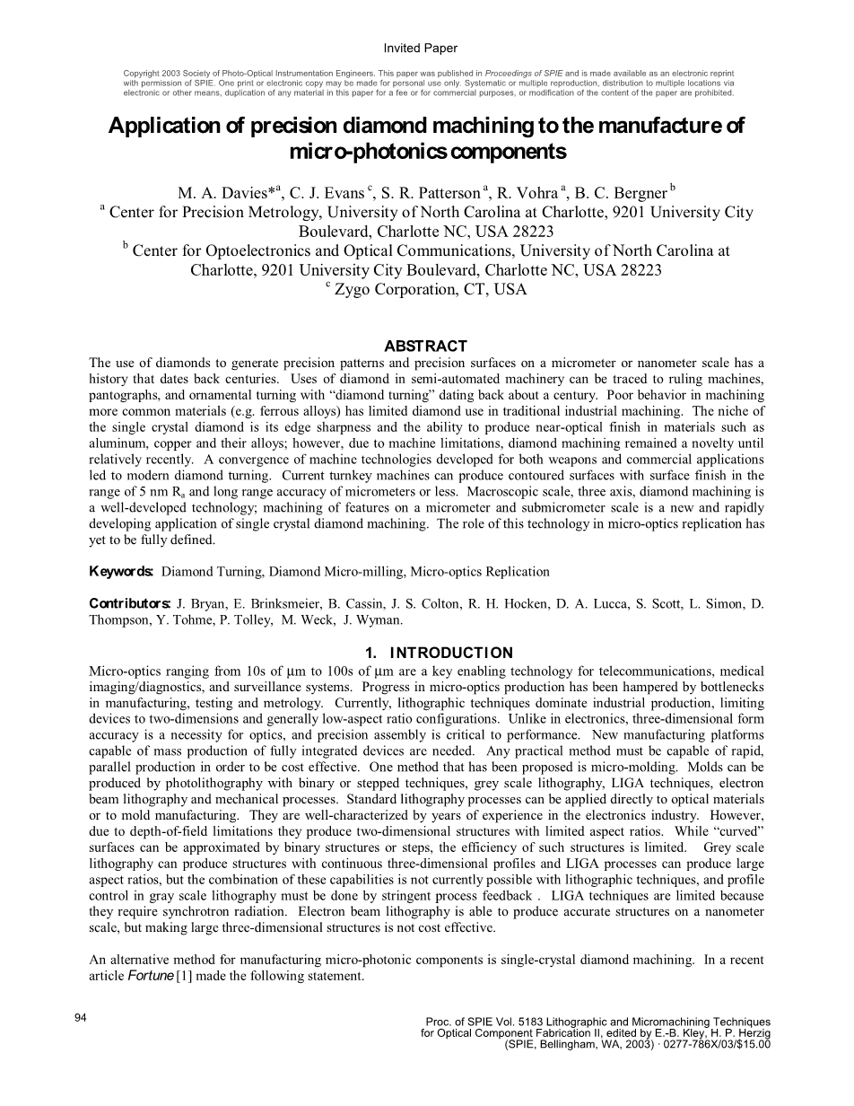 虽然有可能被夸大了,但是对于微观光学模具的超精密加工受到越来越重要的关注,这是个不争的事实。很明显,金刚石加工为微模型成形提供了一些重要的优势,然而,可能性很大的是,微光学中存在问题的解决方案最可能就是现有技术的恰当组合。例如,二元光学特别适用于光刻技术(技术);而宏观尺度轮廓表面与微米或纳米表面结构/模式的加工,则可能需要金刚石加工技术结合光刻技术。从工业中制造相似设备得需要不同的制造方法这一调查显示来看,很明显,这片领域的制造方法是不成熟的,成熟工业的特点应该是类似的产品有着类似的制造技术。