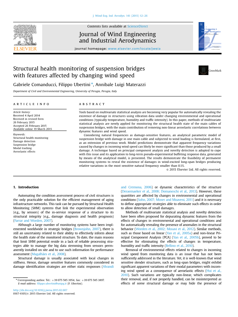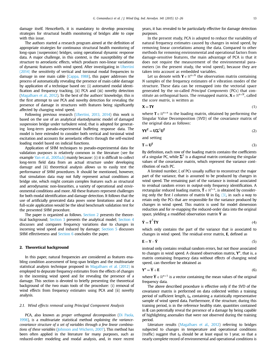 本文作者开始的一个研究项目,目的是使用操作动态响应数据定义一个合适的连续大跨度桥梁(悬索桥)结构健康监测方案。在这种情况下一个重大的挑战是敏感性结构的变形的影响,产生与风速变化的非线性动态特性。乌贝蒂尼(2014)调查了纵向和扭转模态频率的对一个敏感性主缆的伤害后(Cappa,1988),本文索描述的自动显示主缆存在的损害的应用程序技术基于:(i)自动模态识别和频率跟踪,(ii)PCA,(iii)全新检测(Magalhaes et al .,2012)。竭尽作者的所能,这是第一次尝试使用PCA和全新检测技术揭示损伤结构与特性的存在受到风速变化的显著影响。
