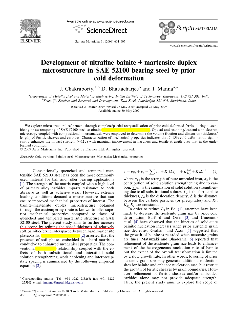SAE 52100已经或预先冷变形的铁素体在奥氏体化和淬火时由于部分再结晶获得超细粒贝氏体和马氏体。运用光学和扫描透射电子显微镜加上成分分析来确定铁素体层和碳化物的体积分数和尺寸(厚度/长度)。力学性能表征结果表明,5%-15%的冷变形显著提高冲击强度,再次成型条件下硬度和抗拉强度也得到显著改善。