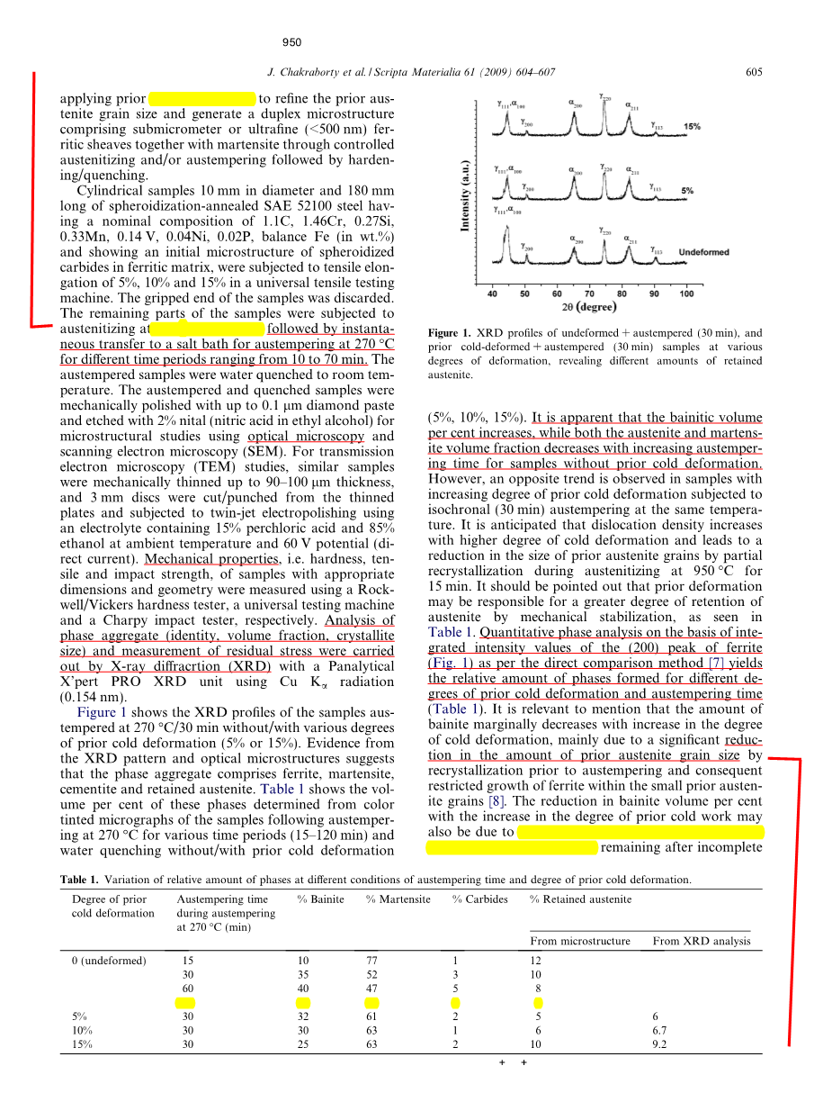 直径10毫米和180毫米长的球化退火的SAE 52100钢圆柱试样含有1.1C,1.46cr,0.27si,0.33mn,0.14 V,0.04ni。平均铁含量,初始显微组织为铁素体上含有球状碳化物,拉伸长度为5%,在万能拉伸试样机上位10%和15%。被夹紧的试样尾部会被丢弃,样品的剩余部分进行950度15 min奥氏体化后瞬时转移到盐浴270度等温淬火从10到70分钟不同时间周期。等温淬火后的试样水冷至室温。等温淬火和淬火试样进行0.1的金刚石研磨膏抛光和2%硝酸酒精溶液(乙醇酸)蚀刻之后利用光学显微镜和扫描电子显微镜(SEM进行显微结构观察。透射电子显微镜(TEM)研究表明,由薄钢板切割/冲压成的厚度减至9-10lm ,3mm的圆盘,受到含有15%的高氯酸和85%乙醇的电解质在室温和60 V电位(直流电流)下双喷电解作用。具有适当的尺寸和几何形状的样品用洛氏/维氏硬度计,万能试验机,冲击试验机分别测量各项力学性能,硬度,拉伸强度和冲击强度。相综合分析(身份、体积分数、晶粒尺寸)和残余应力,使用X射线测量。