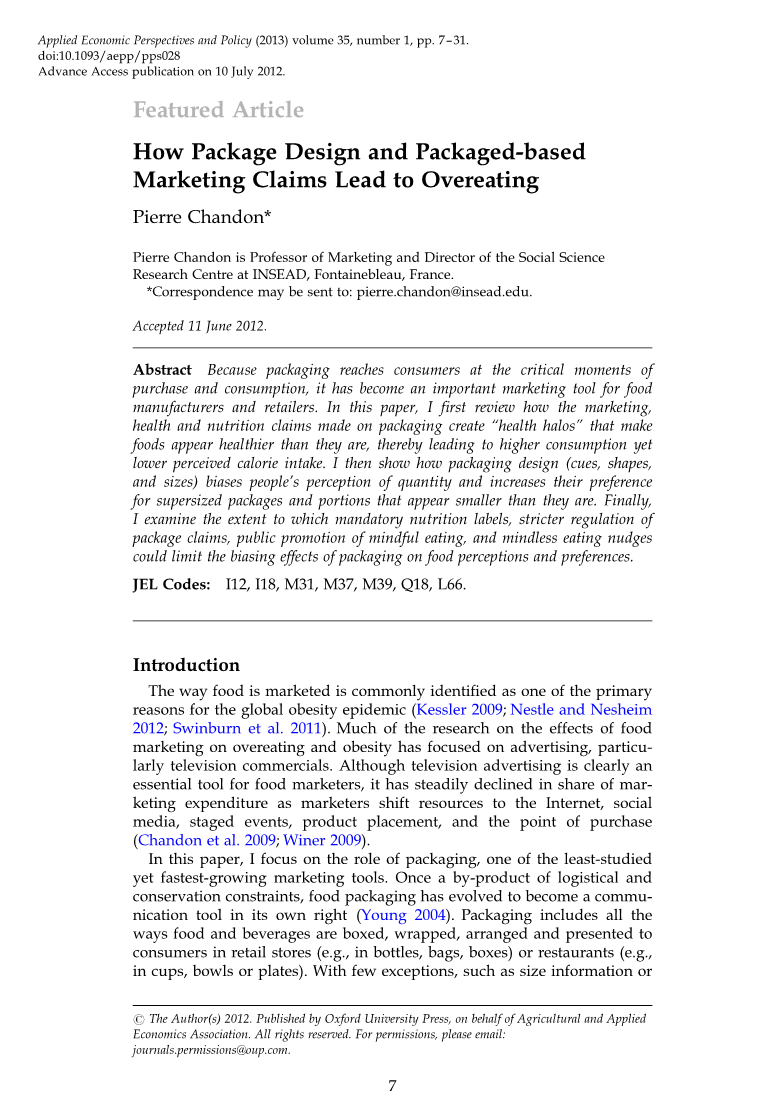 本文的目的是检查食品包装的设计和印刷对他们的营销,健康和营养声称如何影响食物摄入量,并导致暴饮暴食。为了实现这一目标,我先考试系统沟通上的营销,健康和营养声称是如何影响人们的预期(多么好的菜的口味,这是多么健康等),他们的实际经验,以及他们消费。然后,我检查增加尺寸和食品包装,年龄,份量和服务货柜量所有的偏见看法的改变形状,以及如何将这些偏见提示消费者如何选择较大的饭菜。最后,我将讨论可能的政策解决方案,旨在限制食品包装对全球肥胖流行的贡献。