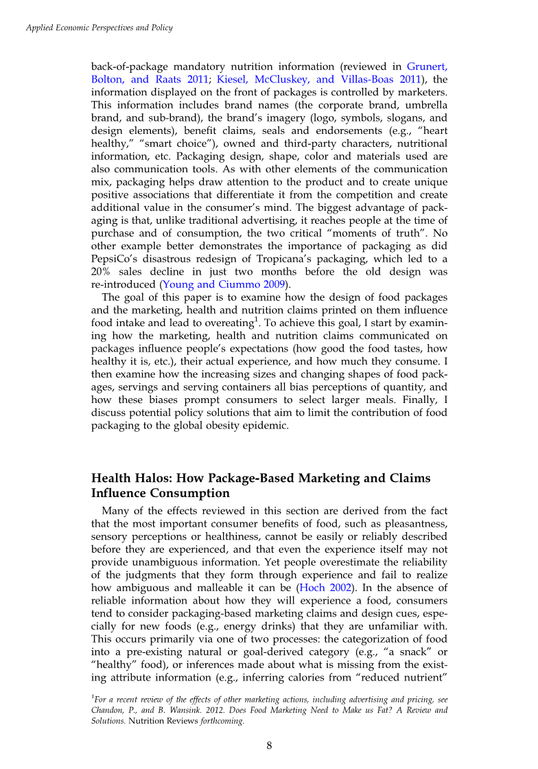 在本节回顾影响一个事实,即食物的最重要的消费利益,如愉悦,感官知觉或健全,不能轻易或可靠地描述他们经历过,并得出,即使是经验本身不可以提供明确的信息。然而,人们高估了,他们通过经验形成的判断的可靠性,并没有认识到它是如何暧昧和延展性能(2002霍克)。消费者往往会考虑包装为基础的营销主张和设计线索,尤其是为新的食物(例如,能量饮料),他们不熟悉。出现这种情况主要是通过两种方法之一:什么是由缺少制成食品分类成预先存在的天然或目标衍生类别(例如,“小吃”或“健康”的食品),或推论存在属性信息(例如,从推断“减少营养素”卡路里(对于近期的其他营销行为,包括广告和定价的影响审查,见悦,P.,和B.万辛克。 2012年确实食品营销需要让我们胖?回顾和解决方案。营养点评即将出台)。