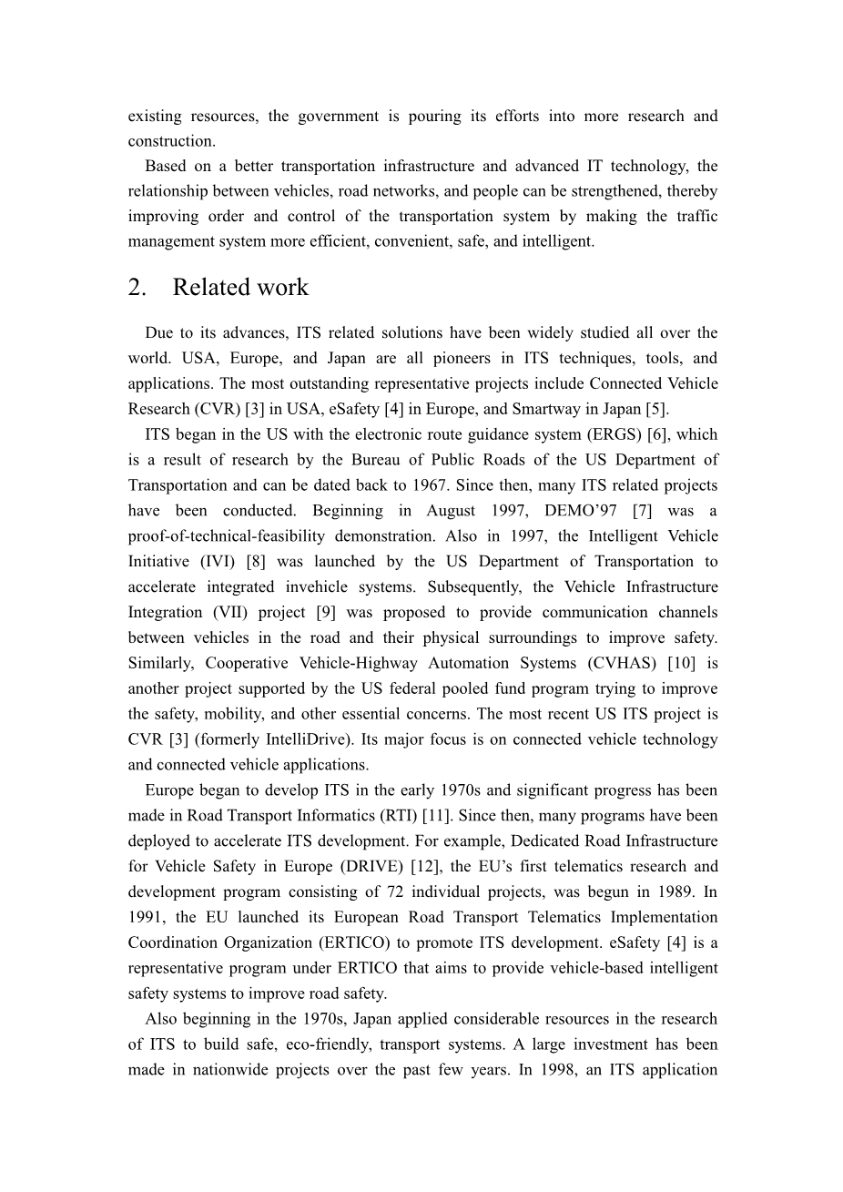 由于其进展,ITS相关的解决方案在世界各地已被广泛研究。美国,欧洲,和日本在ITS的技术,工具和应用方面都是先驱者。最具代表的项目包括美国的连接车辆研究(CVR)[ 3 ],欧洲的电子安全[ 4 ],日本的智能公路[ 5 ]。