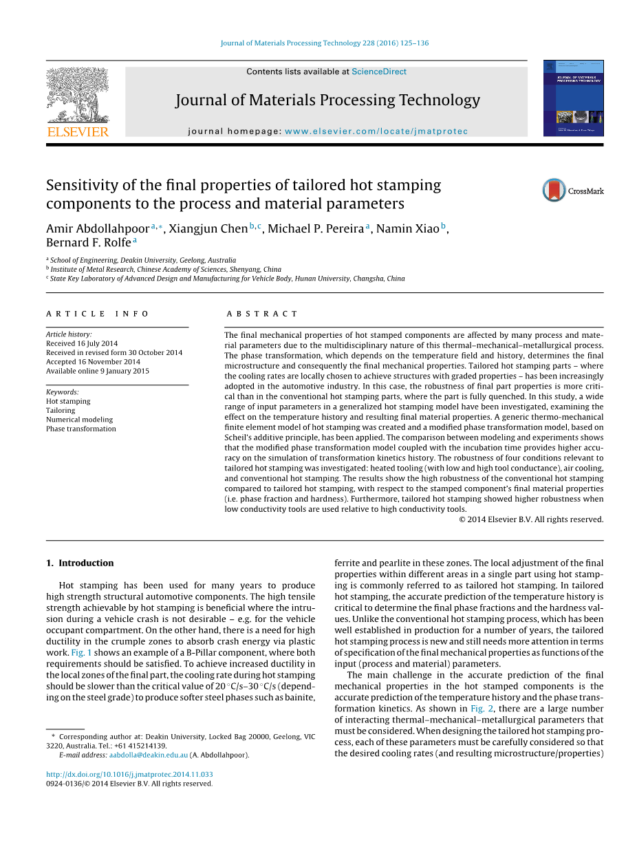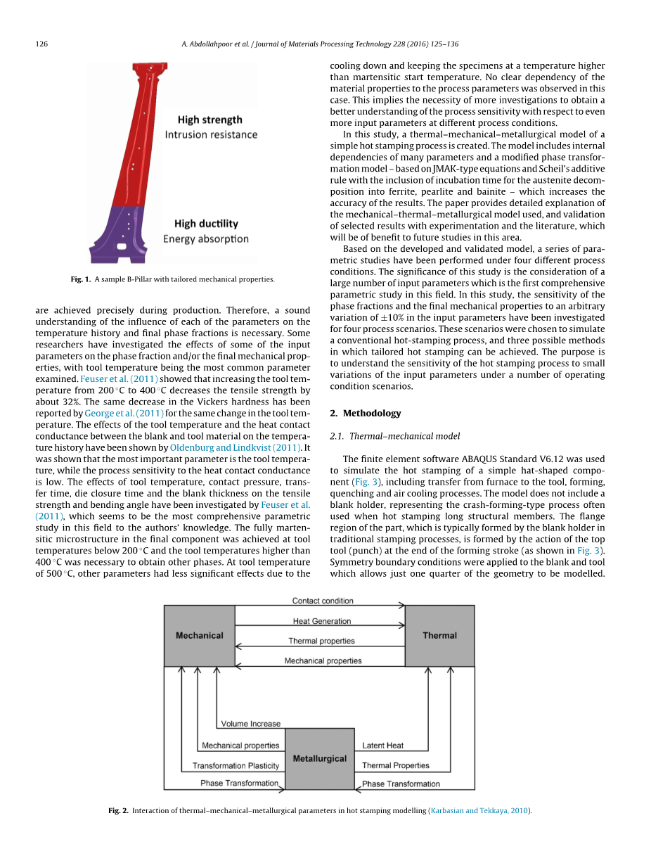 热冲压零件的最终力学性能的工艺和材料参数,受到热–机械–冶金过程中的多种学科因素的影响。相的转变,取决于温度场和相的来源,它决定了最终的微观组织和力学性能的最终结果。定制的热冲压件的冷却率在本地选择实现结构分级属性——已经越来越多地采用在汽车行业。在这种情况下,最后的部分性能的强度比传统热冲压件更重要,其中部分用的是完全淬火。在这项研究中,大范围的输入参数对广义热冲压模型进行了调查,分析影响温度随时间的变化过程和最终形成的材料特性。一个通用的热机械有限元模型的建立和改进热冲压相变模型,应用了基于Scheil的叠加原理。模拟与实验结果的比较表明,改性后的相变模型再加上转化时间提供了更高的精度上的相变动力学的模拟。对热冲压强度的以下四个相关条件进行研究:加热的工具(低和高工具的电导),空气冷却,和传统的热冲压。结果表明,和传统的热冲压相比,相对于盖部件的材料最终性能(即分数和硬度)来说,定制热冲压有更高的强度。此外,量身定制的热冲压具有较高的强度同时,相对于高导电性的工具来说导电性更低。