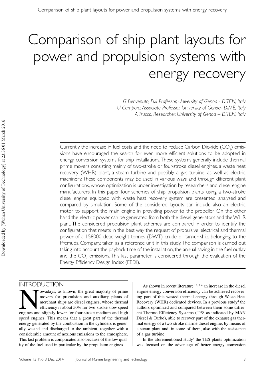 目前,因为燃料成本的增加,减少二氧化碳(CO 2)排放量的需求,鼓励在船舶能量转换系统装置方面采用更有效的解决方案。这些系统一般包括热力原动机为主的二冲程或四冲程柴油机,余热回收(WHR)器,汽轮机和部分燃气轮机,以及电动机械。这些组件可以通过不同的设备配置用在不同的方面,研究人员和柴油发动机制造商正在研究其最优组合。在本文中,用四种船舶动力装置的方案,对有余热回收系统的二冲程柴油机通过仿真进行了研究、分析和比较。一个好的的方案不但包括一个支持主发动机给螺旋桨提供动力的电动马达。而且电力可以从柴油发电机和余热回收器中产生。以premud公司的158000吨载重的原油油轮作为研究对象,为了确定最满足推进、电力和热功率的方案,各个船舶推进装置方案进行了比较。通过比较将会得到设备的回收期、每年节省的燃料和二氧化碳排放量的数据。最后的参数通过能效设计指数(EEDI)评估得出。