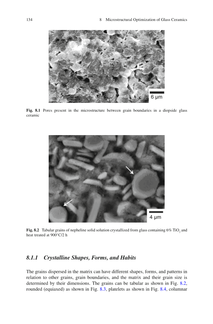 主晶相颗粒的形态特征通过描述其形状,大小,以及颗粒分散在玻璃基质中的分布状况来表征,这反过来又控制其性能。例如可以通过优化微观结构使其获得所需的机械性能,化学电阻,显微硬度和光学特性。最理想的显微结构通常被描述为具有细密纹理的主晶相和近乎相同的晶粒尺寸、均匀且细小的晶粒尺寸分布以及不同种类颗粒在玻璃基质中随机分布的相。