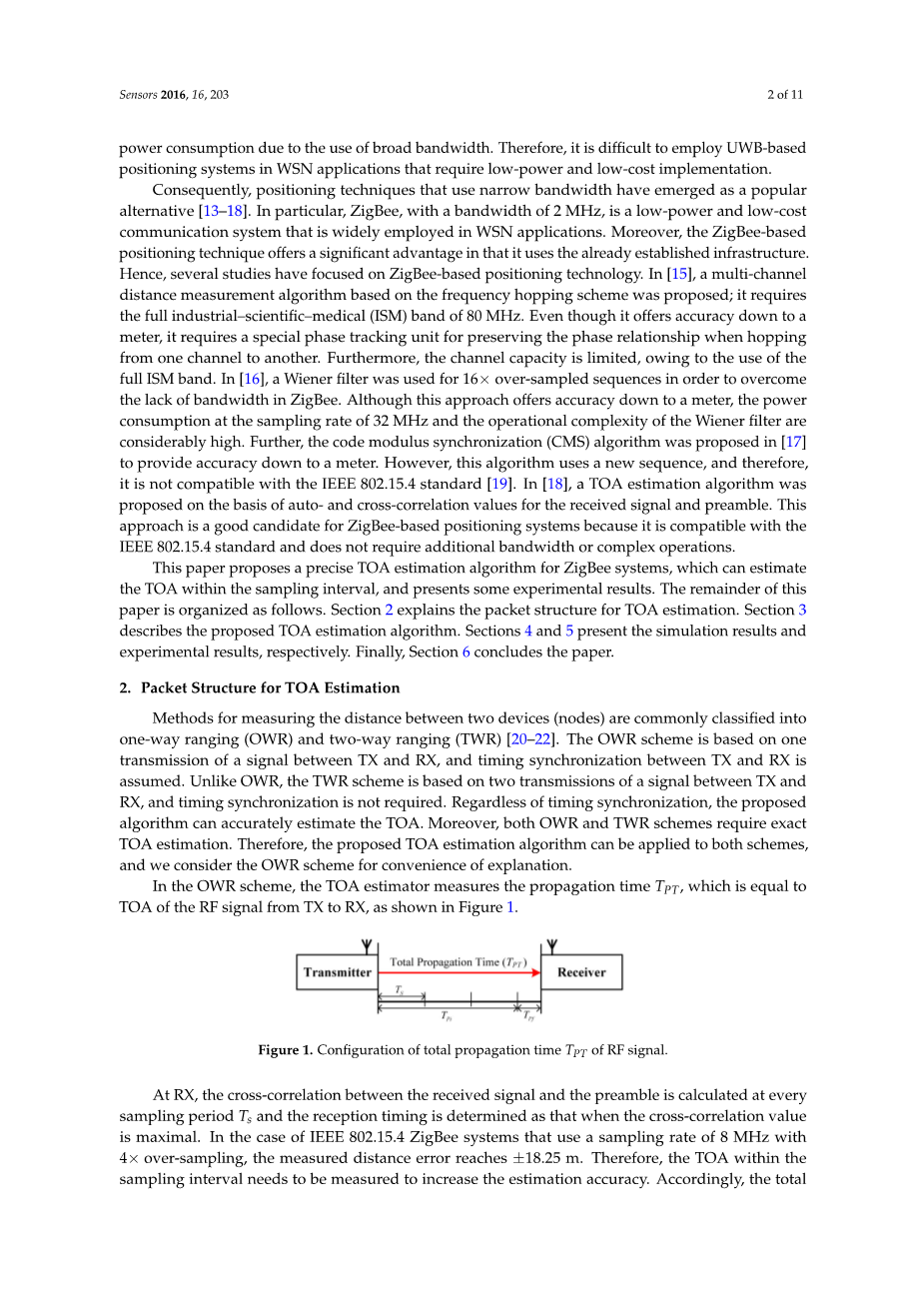因此,使用窄带宽[13-18]的定位技术已成为一个不错的选择。特别是拥有2 MHz带宽,的ZigBee是一种低功耗、低成本的通信系统,被广泛应用于传感器网络应用程序。此外,基于ZigBee的定位技术在它使用已经建立的基础设施中建立了一个重要的优势。因此,一些研究集中在基于ZigBee的定位技术。[15] 基于跳频方案的多通道测距算法被提出了;它需要ISM完整的80 MHz。虽然它提供了一个精确到一米的精度,但是它需要一个特殊的阶段跟踪单位从一个频道到另一个频道保留跳跃时的相位关系。此外 ,由于使用完整的ISM波段,信道容量是有限的。[16]为了克服ZigBee带宽的缺乏,维纳滤波器被用于16times;过采样序列。尽管这种方法提供了一个精确到一米, 32 MHz采样率的功耗和维纳滤波器的操作复杂性提高了。此外,模量同步的代码(CMS)算法[17]提供一个精确到一米的精度。然而,该算法使用了一个新的序列,因此,并不能适用于IEEE 802.15.4提供的服务标准[19]。 [18]TOA估计算法的基础上提出了自动接收信号互相关值和序言。这种方法是一个很好的候选人ZigBee-based定位系统内部,因为它是符合IEEE 802.15.4标准提供服务,不需要额外的带宽或复杂的操作。