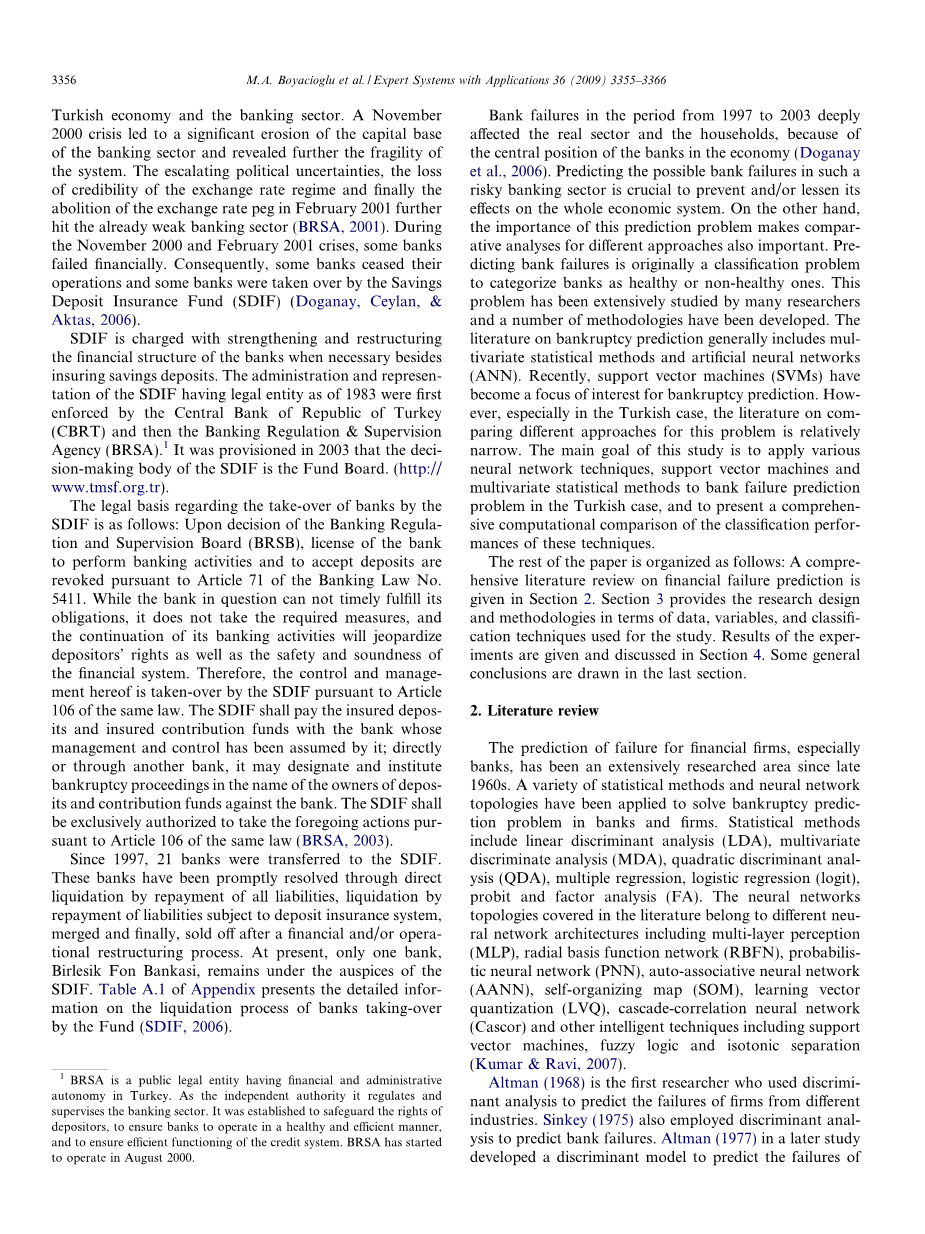 在这样一个银行业风险部门预测可能的银行倒闭对于预防和减少它对整个经济系统的影响是至关重要的。另一方面,这种预测问题对于不同方法的比较分析也很重要。预测银行破产是一个首要的分类问题,将银行分为运营正常和不正常的。这个问题已被许多研究人员进行了广泛的研究,许多方法已经研究出来。破产预测一般包括多元统计方法和人工神经网络。最近,支持向量机(SVMS)已经成为对破产预测的一个焦点。然而,特别是在土耳其的案例中,这个问题比较不同方法的文献相对稀少。