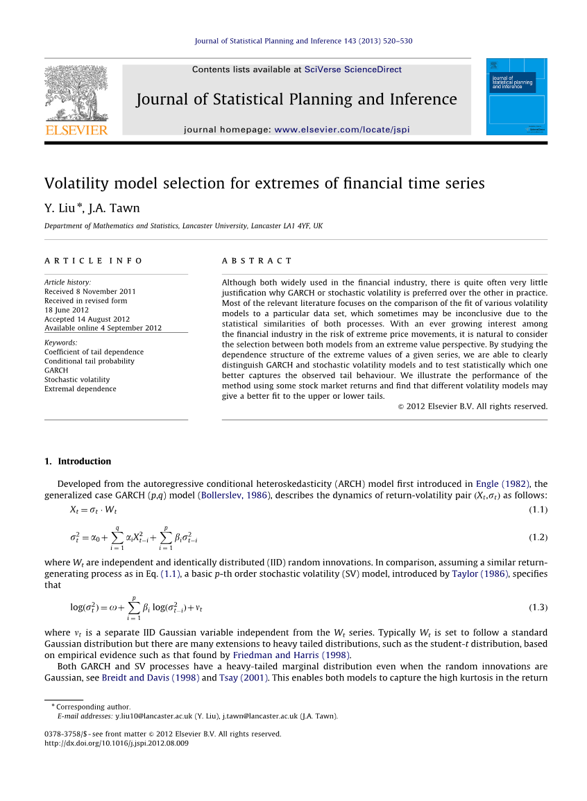 尽管GARCH和随机波动模型广泛运用于金融业中,但往往没有理由来说明GARCH或随机波动模型在实践中优于其他的模型。大部分相关的研究注重于不同波动模型对于特定数据集拟合的比较,这时优于过程统计的相似性,可能存在不确定性。在极端价格波动的情况下,金融业的利息随着增加,很自然会从极端价值观考虑模型的选择。通过研究所得到的极端价格的序列的相关结构,我们能够清晰的区分GARCH和随机波动模型并且统计上的测试哪一个模型能捕捉所观察的尾行为。我们说明了对某些股票收益所使用方法的绩效,并且发现了不同波动模型可能对上尾或下尾有更好的拟合。