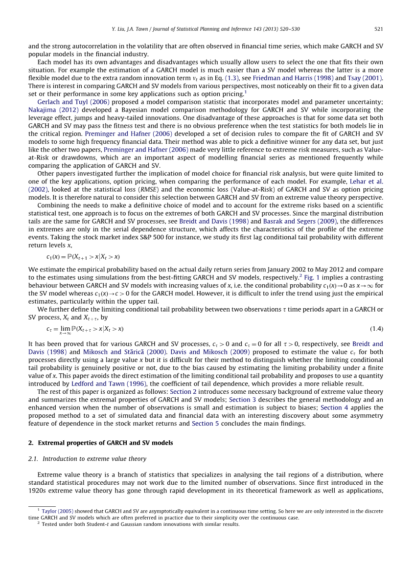 对于GARCH和SV模型,已经被证明和对于所有的,见Breidt和Davis(1998)。Mikosch和Starica(2000),Davis和Mikosch(2009)提出了对于这两个模型,直接采用大样本x来进行估计,但是由于在x有限的情况下来估计限制概率,会造成偏差,因此用他们的方法来判断限制条件尾概率是否为正很困难。本文避免了直接估计限制尾概率并且提出了用介绍量,相依尾系数,可以得到更为可靠的结果。