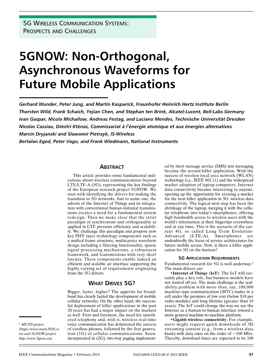 本文基于欧盟的研究项目5GNOW,阐述了一些下一代无线通信LTE-A(5G)的基本的特点,我们从应用需求来开始描述5G的网络过渡。我们首先说明,物联网的到来和它的一体化对传统的人类通信方式提出了创造重新设计一个基本系统的需求。然后我们明确表示,严格同步性和正交性的范式应用于LTE阻碍了频谱效率的提高我们挑战这个规范,并提出新的物理层技术的关键。如一个统一的框架结构,包括滤波功能的多载波波形设计,稀疏信号处理机制鲁棒性框架,和极短的传输时延。这些5G的关键技术确保了高效可扩展的空中接口和支持高度灵活的业务需求支持。