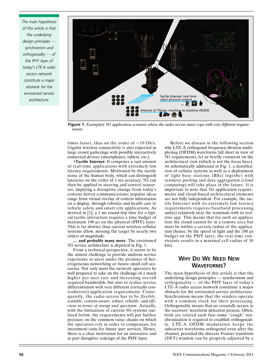 总之,其中多个用户被分配的宽时间同步的频率资源的5G方案必须通过新的波形来解决。这样的波形必须实现尖频notches和紧频谱屏蔽,以不干扰其他传统系统,并且稳健异步信令和处理不协调的干扰。传统OFDM方案不适合,由于环状前缀(CPS)或循环后缀(CSS)的保护间隔的不灵活处理(GIS) - - 以及较差的频谱定位。 在后面的章节中,我们讨论的波形将实现 的定位(例如,LTE-A OFDM的35分贝旁瓣与相比多载波滤波器组(FBMC)55分贝旁瓣[8]),这就是零散频谱方案和CoMP方案一个真正的区别。