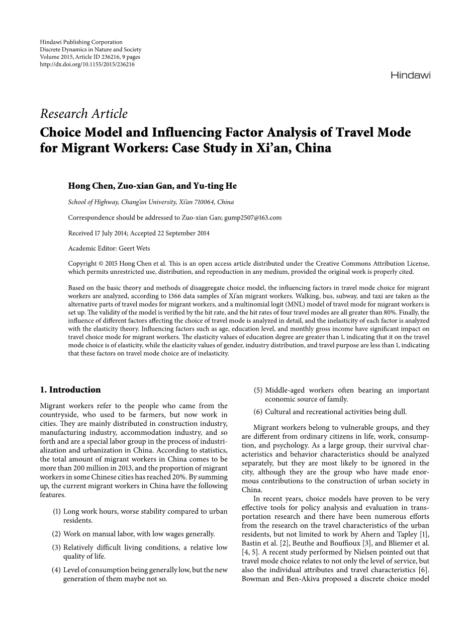 农民工属于弱势群体,他们生活、工作、消费和心理方面都不同于普通的城市居民。农民工们作为一个大群体,他们的生存特征和行为特征应该分开来进行分析,但是他们在城市中又最容易被忽视,尽管他们是对中国城市社会建设做出巨大贡献的群体。近年来,选择模型已被证明是在运输研究的政策分析和评估非常有效的工具,对与城市居民出行特征的研究已经有大量的成就,然而这些对于Ahern and Tapley [1],Bastin et al. [2], Beuthe and Bouioux [3], and Bliemer et al.[4, 5]等人并不能适用。 一个由Nielsen最近发表的研究指出,出行方式的选择不仅仅关系到企业的服务水平,也关系到个体属性与旅游特性[6]。Bowman和Ben Akiva结合1991波士顿出行调查数据为例,基于个人活动和旅行计划,提出了一种预测城市客运的离散选择模型,结果表明预期效用最大化影响了旅客对出行方式的选择[7]。当非集计模型用于住宅的选择和出行方式选择的联合选择模型的评估,一个居住和出行方式基于非集计模型的联合选择模型就可以建立了[8,9]。伊万诺娃用多项Logit模型和分层Logit模型建立了出行方式选择的模型[10]。萨利赫和法瑞尔在爱丁堡中心城区对于工作和非工作旅行的居民建立了出行时间选择模型,如果要收取拥堵费,分析了出行时间的变化。选择行为是一个复杂的决策过程;许多因素影响着人们的出行选择的需求。就像赫斯所调查的那个例子中讨论的那样,一系列因素,包括光的频率,灵活的票、容量、进度延迟,都会影响人们对航空公司的选择[12]。 kwigizie等人,利用个体属性、社会经济属性、出行特征,分析了具有跨层次模型的出行方式的概率[13]。 贝尔一直关注于非货币因素的影响,如旅行时间,旅行对城际铁路需求[14]。根据Vega和雷诺兹费汉和赫斯等人的研究,住宅实用系统,出行方式,和离开的时间应该是由旅行时间,旅行费用,房地产价格和旅客的经济属性和社会属性所决定的[15,16]。此外,当旅游者的社会经济特征是固定的,在解释 中长途旅行和更长的距离旅行出行钢丝选择的变化中土地利用属性和旅行时间是很重要的[17].