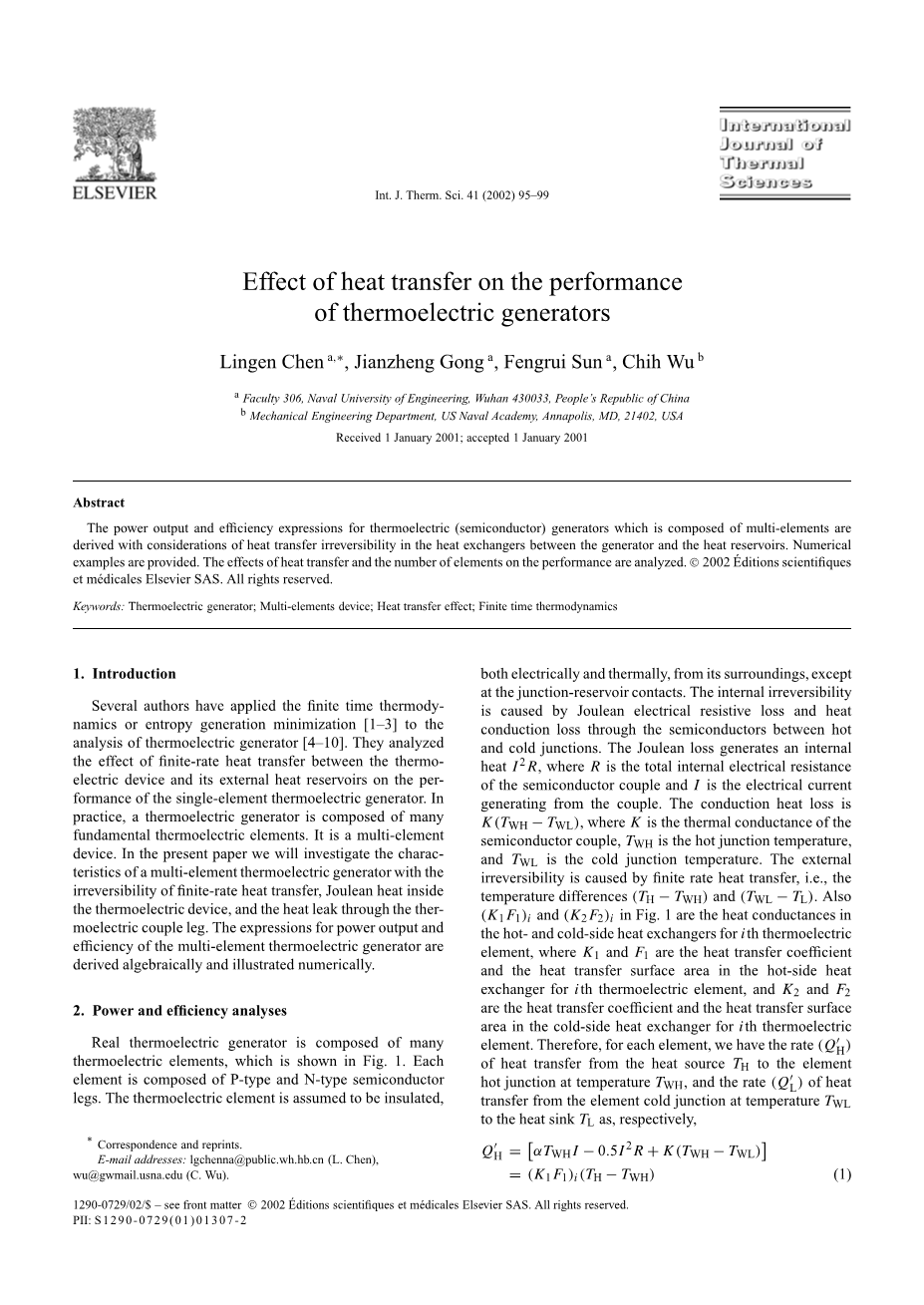 摘要:由多个元件组成的热电发电机(半导体)的输出功率和热电转换效率的表达式考虑了热交换器与热电发电机之间的热不可逆性和热储存。本文研究举出了具体数值例子,并分析了热传递和热电元件数量对热电发电机性能的影响。