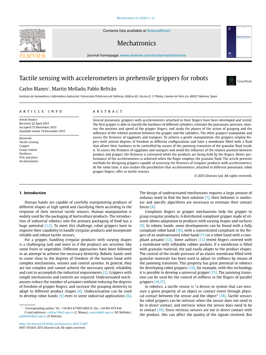 机械手上连接几个加速度计的气动夹持器已经被开发和测试。第一个机械爪是能够区分气缸在不同的工作化境下的硬度,估算气缸内部压力,夹持器的手指能监视的气缸执行件的位置和速度,从而研究气缸行动阶段抓取器与气缸的相对位置对气缸内部压力的影响。另一只机械手夹持器可以测定茄子和芒果的硬度,采取一个柔性的手法,即在夹子与手指中有一个充满流体的有不同配置的多自由度手指,使其硬度可通过对里面的颗粒流体干扰过渡到控制膜的手段来间接测量。评价茄子和芒果的硬度,避免产品和夹具之间的相对位置的影响,当产品被手指抓起来的时候,估计的硬度。为了使加速度计的性能更好的实现,手指采用颗粒流体。本文介绍了利用加速度计把不规则产品抓取并估算其硬度的气动夹持器的方法。 在同一时间, 它还研究了利用加速度计附着于不同的气动机器人夹持手指,提供作为触觉传感器的可能性。