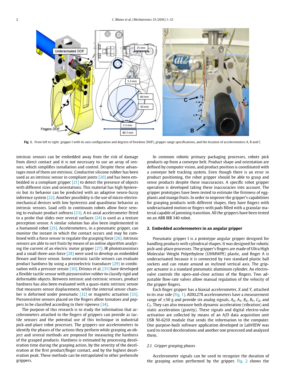 图 1从左至右:夹持器与它的轴配置和自由度,夹持范围规格,以及加速度计的位置A和B和C