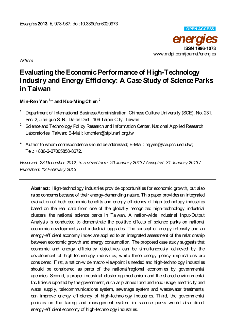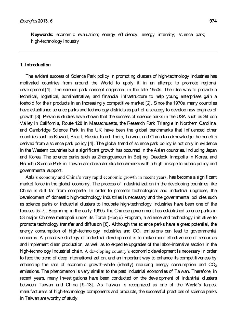 摘要:高技术产业的发展提供了经济增长的机会,同时因为他们的能源需求的性质,也提高了关注度。本文提供了一个全球公认的高科技产业集群,基于台湾科技园区的真实数据,并对其经济效益和能源效率进行综合评价。分析一个全国性产业的投入与产出,证明科技园区对国民经济的发展和产业升级的积极影响。应用能源强度和能源效率的经济指标的概念,综合评估经济增长和能源消耗之间的关系。研究成果表明,高技术产业的发展可以达成经济和能源效率的目标,存在三个能源政策的影响因素:首先,一个全国性的宏观战略是必要的,高科技产业应被视为政府部门的国家/区域经济部分。二是一个合适的产业集群机制和政府支持的共享环境设施,如规划用地和道路使用,电力和供水,电信系统,污水处理系统可以提高高技术产业的能源效率。第三,政府对科学园区的税收和管理政策,也将直接影响高技术产业经济的发展。