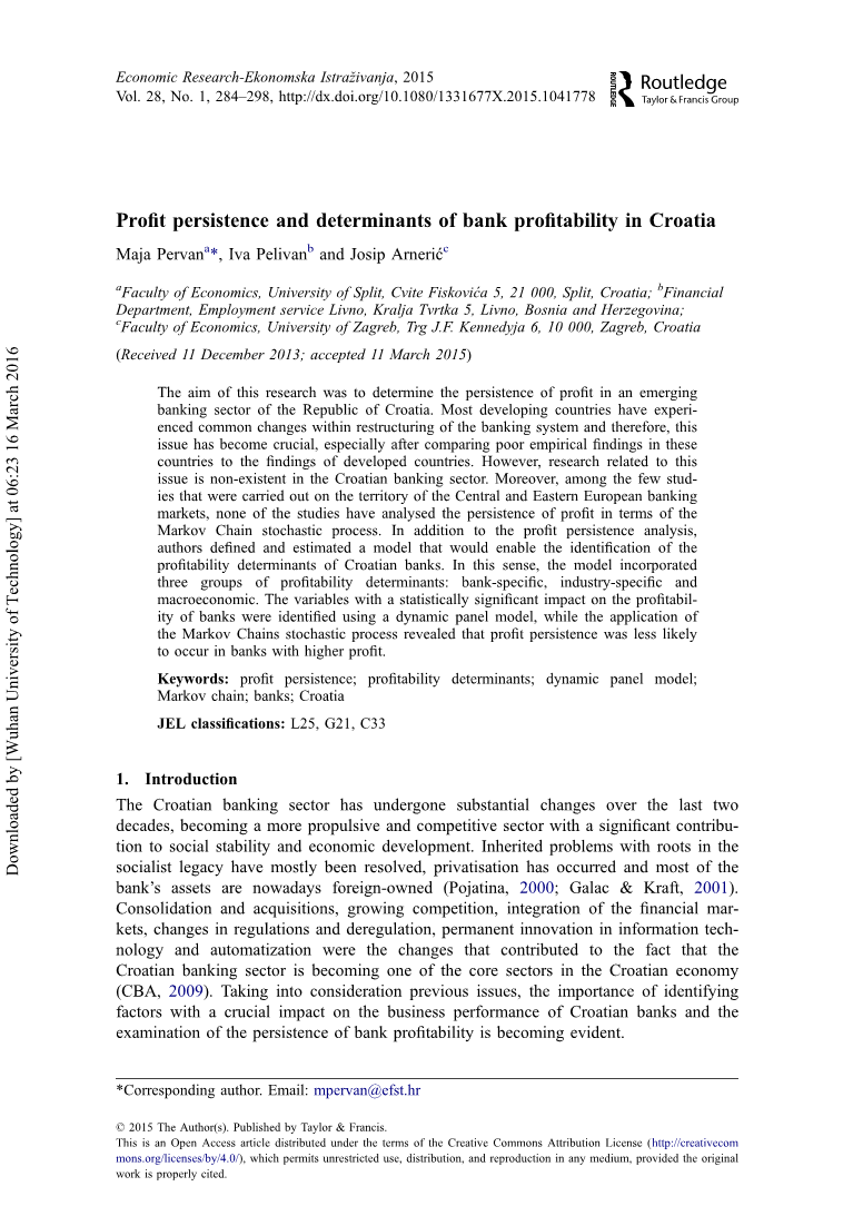 关键词:利润持续性;盈利能力决定因素;动态面板模型;马尔可夫链;银行;克罗地亚