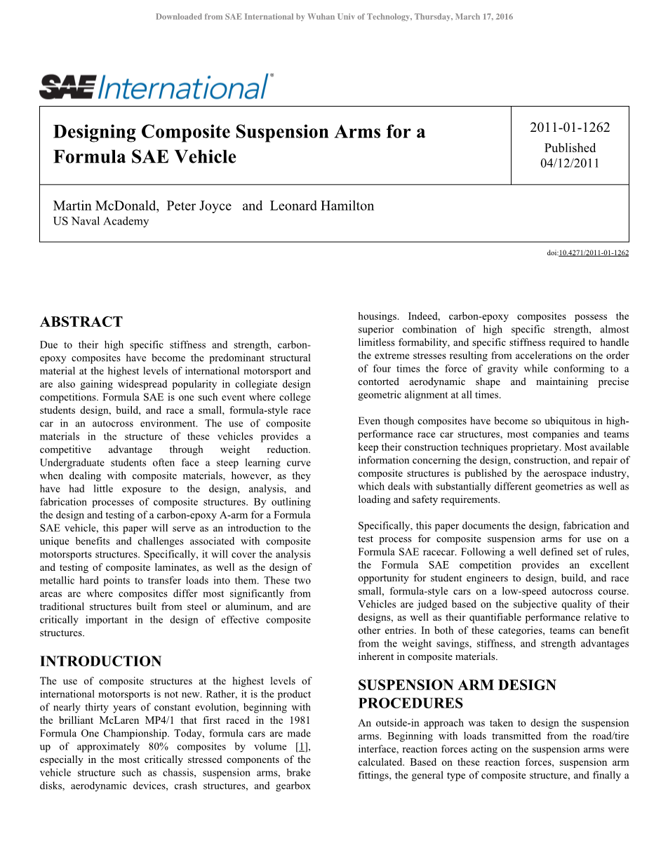由于它们所特有的高强度和刚度,碳环氧树脂复合材料在最高水平的国际赛车运动上占主导地位,同时也在大学设计比赛中广泛的流行。SAE方程式是大学生在汽车越野赛环境下进行设计,构建,竞赛的方程式风格的一个竞赛。这些复合材料在汽车结构中的使用通过减少重量从而获得了竞争优势。大学生在处理复合材料时常常面对一个陡峭的学习曲线。然而他们几乎没有接触过复合结构的设计、分析、制造过程。通过对SAE方程式汽车的碳环氧树脂A型摆臂的设计与测试,本文将介绍与复合赛车运动结构有关的独特的益处和挑战。具体地说,它将涵盖复合材料层合板的分析和测试,以及金属硬点的转移到他们之上的设计负荷。这两个领域是复合材料最重要的区别于传统结构钢或铝的领域,并对设计有效的复合结构至关重要。