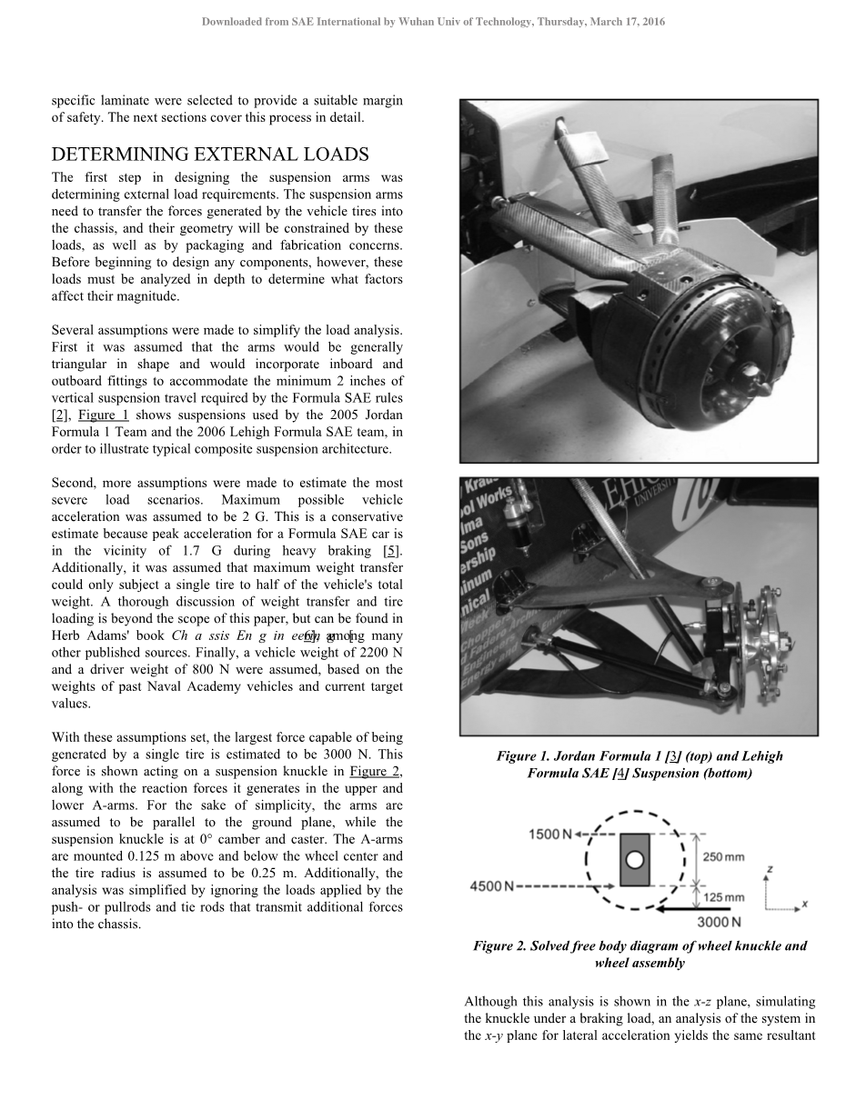 几个假设是为了简化负载分析,首先假设摆臂会以一般三角形的形状来配合内侧和外侧的配件。,以适应SAE方程式规则所要求的最低2英寸的垂直悬挂[2]。图1为了说明典型复合悬架结构显示了2005年乔丹方程式1队所用的悬架和2006年里海SAE方程式团队的悬架。