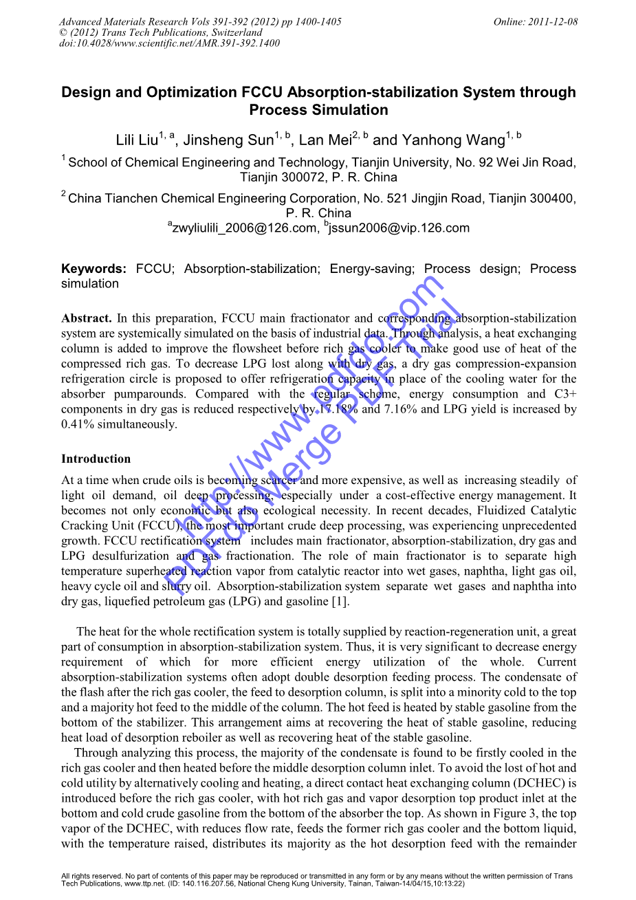 收稳定系统进行了系统的模拟。通过分析,在对富气进行冷却之前,先让其通过一列管式换热器进行热交换,从而充分利用压缩富气热量,以达到改善工艺流程的目的。为了减少干气中液化石油气的损失,提出了一种可产生冷量的压缩膨胀制冷循环工艺用以取代吸收塔中段回流所需的冷却水。相比于常规方案,此新工艺可使能量消耗和干气中C3组分分别减少17.18%和7.16%,与此同时,可使液化石油气的产量提高0.14%。