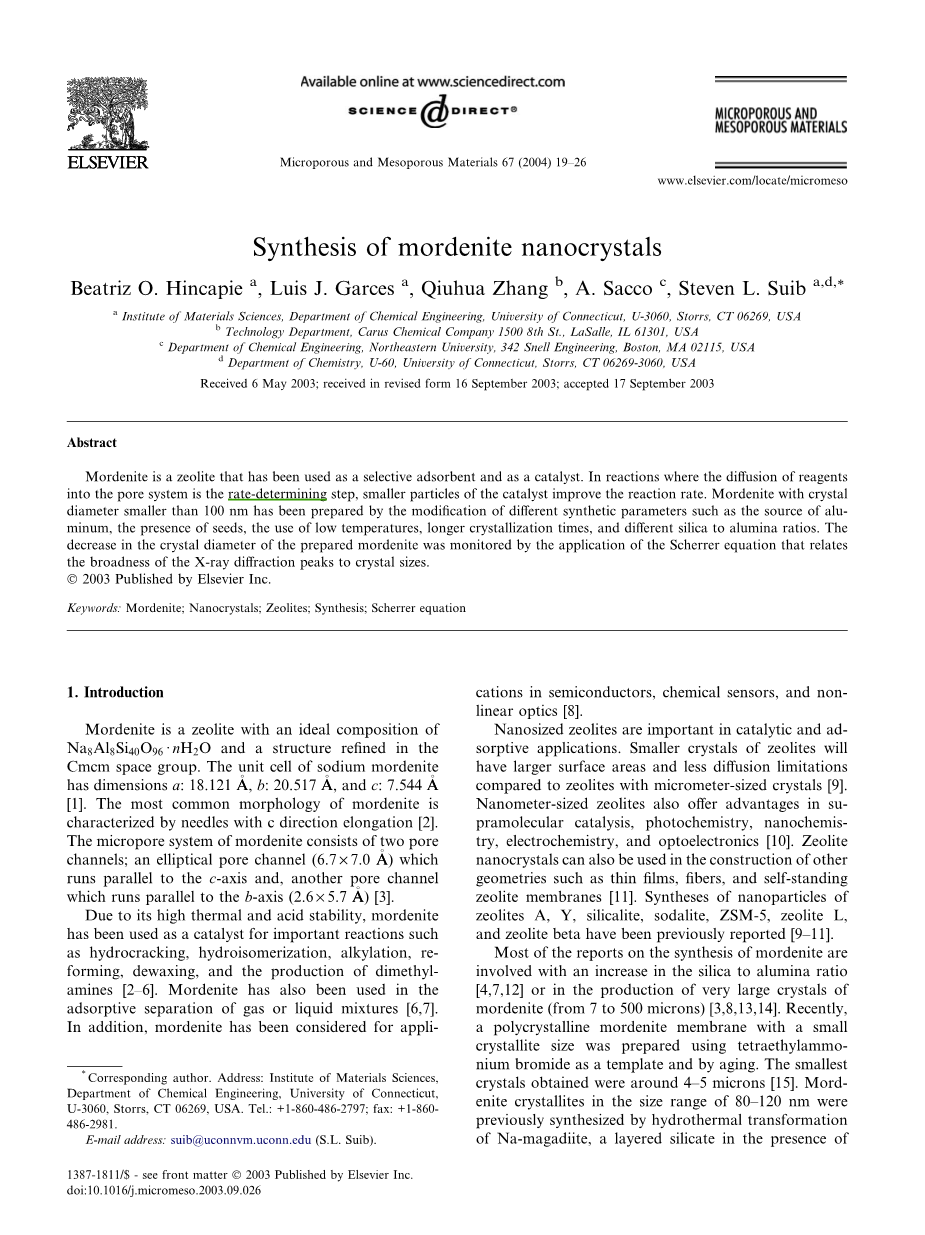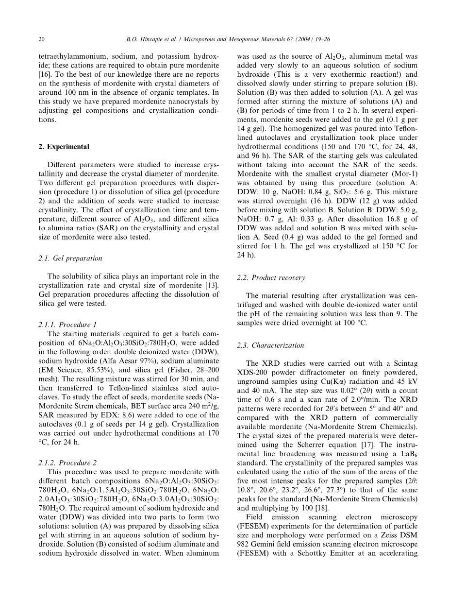 大部分关于丝光沸石合成的报告都会涉及氧化硅/氧化铝比的增大或者丝光沸石产品的晶体尺寸增大(7-500微米)。最近,一种具有小晶粒尺寸的多晶型丝光沸石薄膜被以四乙基溴化铵为模板剂并老化制得。所得的晶体最小约有4-5微米。丝光沸石晶粒尺寸在80-120 nm之间,由Na-麦烃硅钠石,一种层状的硅酸盐,在四乙基胺、钠和氢氧化钾存在的条件下预先水热转变而成;这些阳离子是生成纯的丝光沸石所必需的。据我们所知,在没有有机模板剂参与的情况下,没有合成晶体直径在100nm左右的丝光沸石的报告。在本项研究中,我们通过调节凝胶成分和结晶调节来制备丝光沸石纳米晶体。