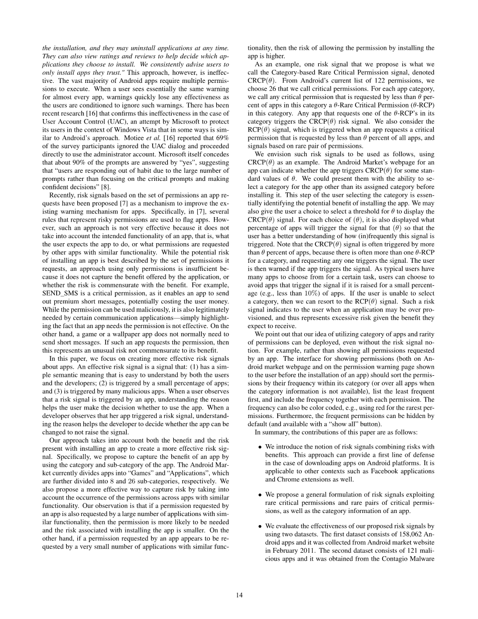 我们想象这样的危险信号使用如下,作为一个例子使用CRCP(theta;)。Android市场的网页应用程序可以显示应用程序触发该(theta;)是否对一些标准的theta;值。我们可以为他们提供应用程序可选择的类别而不是安装前它指定的类别。这一步的用户选择分类本质上是确定的潜在好处安装应用程序。我们也可以给用户一个选择选择一个阈值theta;来显示该(theta;)信号。对于每一个选择(theta;),它也显示百分比的应用将触发的信号(theta;),这样用户更好的理解如何经常触发这个信号。注意,该(theta;)信号通常是由theta;%以上的应用程序,因为通常不止一个theta;-RCP类别,与此同时访问任何一个触发信号。如果应用程序触发信号,那么用户将被警告。作为典型的用户有很多应用程序可供选择某个任务时,如果提高(如很小的一部分,低于10%)的应用程序,用户可以选择避免应用程序触发信号。如果用户无法选择一个类别,然后我们可以诉诸RCP(theta;)信号。当应用程序可能超过供应,这种风险信号会提示用户,因此代表过度风险考虑到他们期望得到受益。