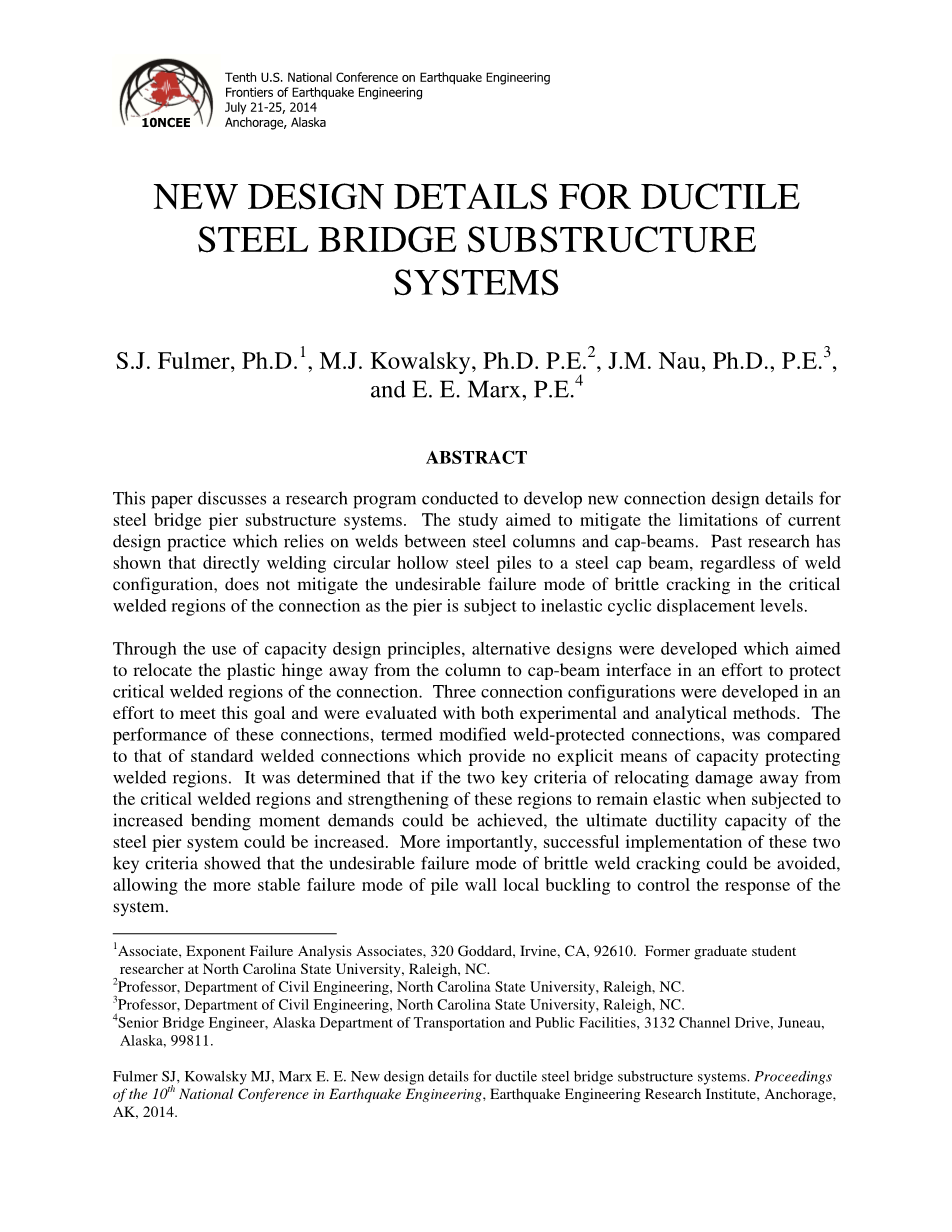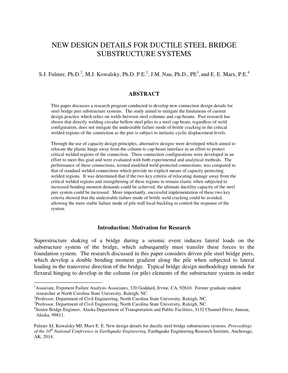 这篇文章探讨一个旨在开发钢桥桥墩基础系统的连接设计细节的研究课题。研究的目的是减轻钢柱和帽梁焊接处通用设计惯例的局限性。之前的研究表明,不管焊缝结构,直接将圆形钢管桩焊接在钢帽梁上,并不减轻处于非弹性循环位移水平的桥墩连接件的临界焊接区域脆性开裂的不良失效模式。