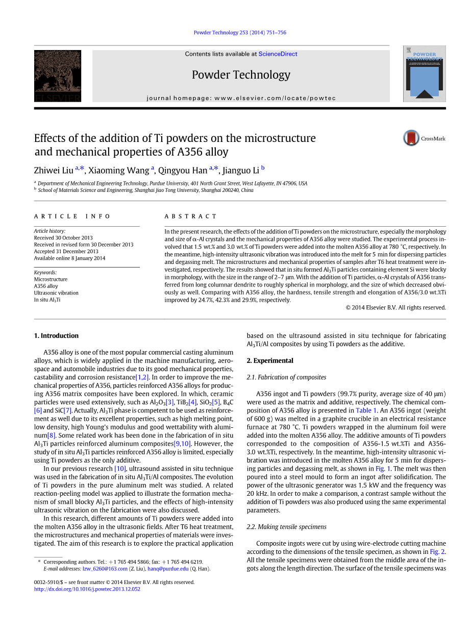 在本研究中,不同量的钛粉体在超声领域加入到熔融的A356合金,经T6热处理后,材料的力学性能和显微组织都受到影响。本研究的目的是探索基于超声辅助原位技术制备用钛粉为添加剂的复合材料的实际应用。