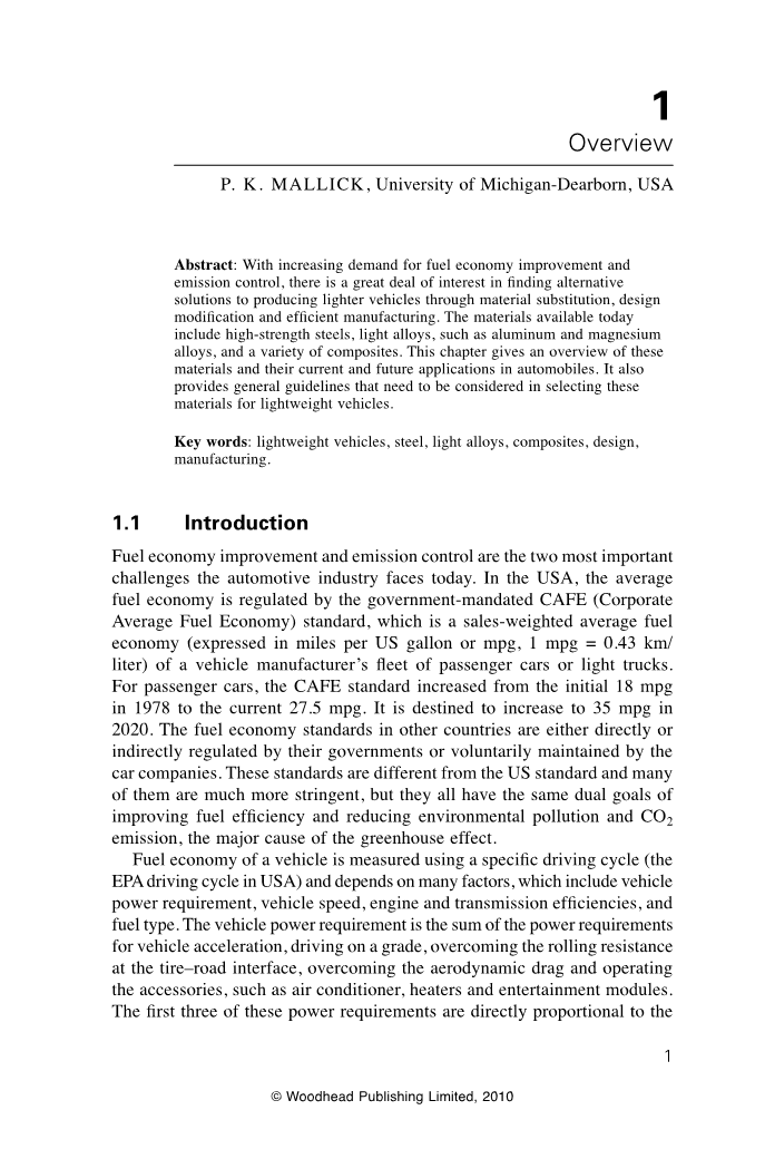 随着燃油价格的增长,石油的长期可用性不得而知,并且人们认识到汽车排放物对环境和公众健康两者都有害,燃油经济性已经成为世界各地的汽车制造商考虑的重中之重。降低车辆的重量被认为是改善燃料经济性的关键因素之一。而车辆小型化仍是用于实现显著降低车辆的重量,至少在不久的将来会有一个选项,将小尺寸和大尺寸的车辆混合,以满足客户需求。另一种选择是使用替代材料、零部件整合和设计优化部件质量来减小整体质量。本章将广泛概述在制作轻量级组件时应用的材料,其中大多数材料的细节在本书的其余章节会有详细的叙述。