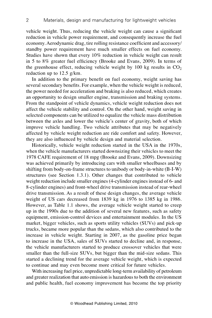 在历史上,减轻车重这一举措在美国始于20世纪70年代,当汽车制造商开始减轻自己车辆的质量,以满足1978年CAFE18英里(布鲁克和埃文斯,2009年)的要求。减小尺寸是将车身与车架分离式结构转变为承载式车身和白车身(B-I-W)结构(参见1.3.1节)来初步实现汽车上较小的轴距。减少车辆的重量组成的其他变化包括小型发动机(4缸发动机代替6-和8缸发动机)和前轮驱动变速器代替后轮驱动传输。这些设计变化带来的结果是,美国汽车的车辆的平均重量从1976年的1839kg变成1986年的1385kg。如表1.1所示,车辆的平均重量从20世纪90年代开始攀升,这是由于添加了多项新功能,如安全设备,排放控制装置和娱乐模块。在美国市场,大尺寸的车辆如运动型多功能车(SUV)和皮卡比轿车更加受欢迎,这也促成了车重的增加。从2007年开始,汽油价格开始在美国市场上升,导致SUV的销量也开始下降,为了适应市场,车辆制造商开始生产比全尺寸的SUV小但比中等尺寸的轿车要大的的交叉型车辆。这开始作为车辆的平均重量,预计这样的车辆会继续甚至有可能成为未来的汽车更重要的质量下降标志。