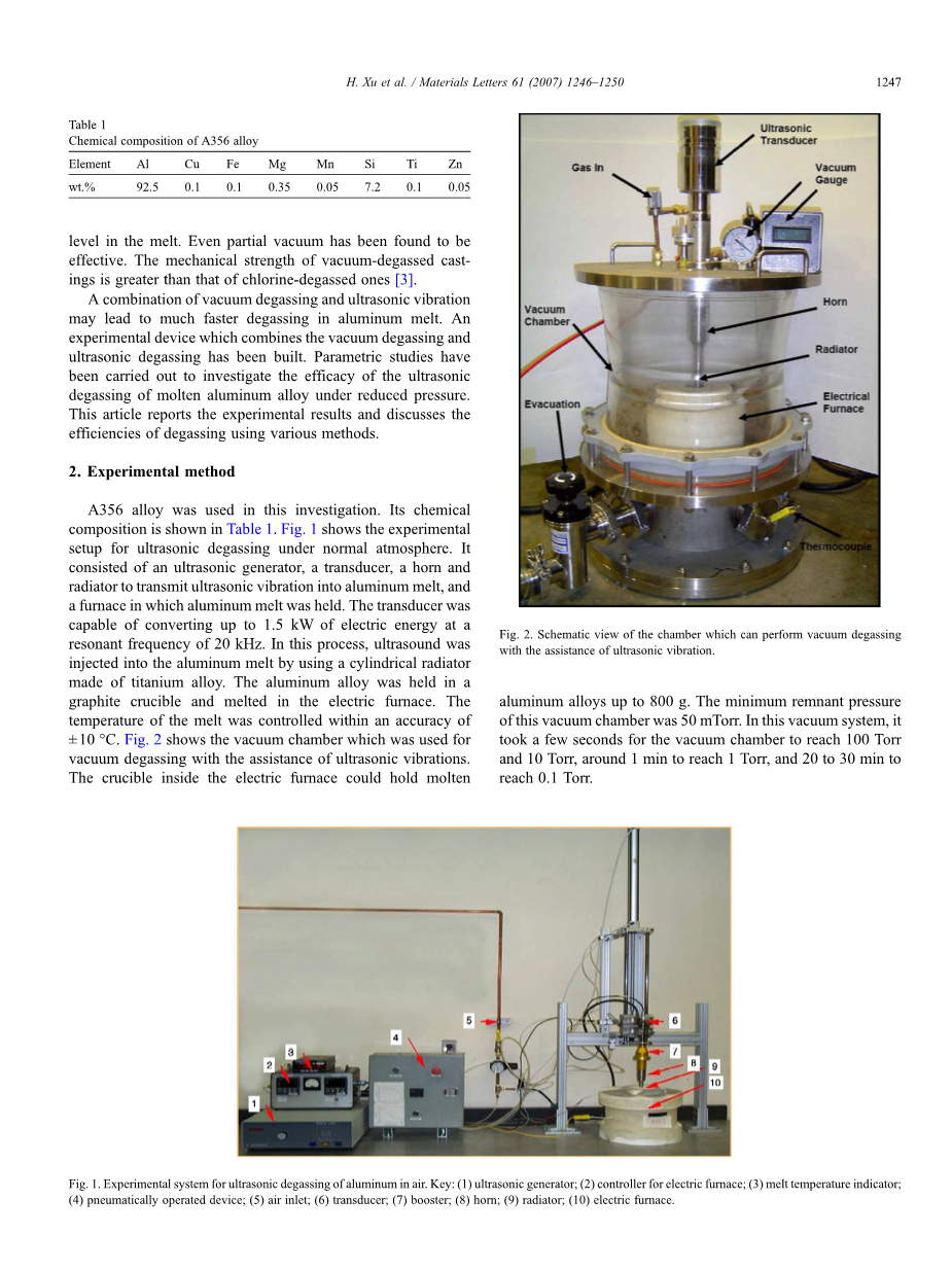 真空脱气与超声波振动的是在两个不同的残余压力条件下进行:分别是100托1托。在720°C下和在50%°C下进行了实验。熔体的重量是0.6公斤。