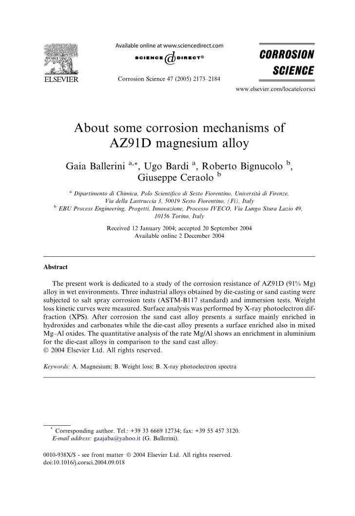 目前的工作是致力于AZ91D(91%Mg)镁合金在潮湿环境中的耐腐蚀性的研究。三种压铸或铸造的工业合金进行盐雾腐蚀试验(astm-b117标准)和浸渍试验。测量重量损失动态曲线,通过X-射线光电子衍射(XPS)分析表面。腐蚀后的砂铸合金表面主要富集氢氧化物和碳酸盐而压铸铝合金表面富集混合镁铝氧化物。镁/铝比率的定量分析表明,与铸造合金相比,压铸合金含铝较多。