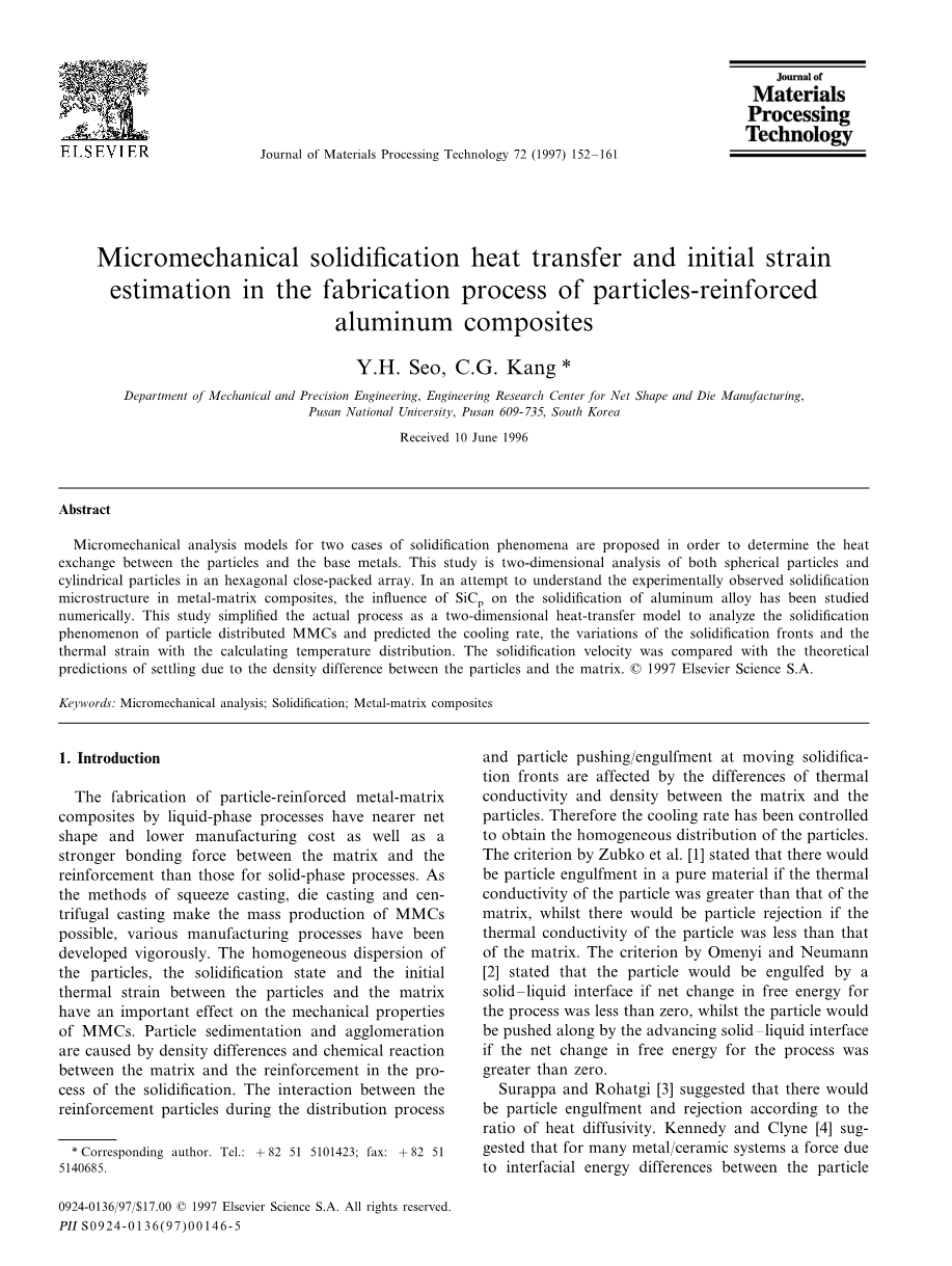 为了确定颗粒和基体金属之间的热交换,两种凝固现象的微机械分析模型被提出。这项研究是两个球形颗粒和圆柱形颗粒在六方紧密堆积阵列的二维分析。 在试图了解实验观察到在金属基复合材料的微观凝固组织,把碳化硅颗粒对铝合金的凝固的影响进行了数值研究。本研究的实际过程简化为用二维传热模型分析粒子分布的金属基复合材料的凝固现象和预测的冷却速度以及凝固前沿和热应变随温度分布的变化。
